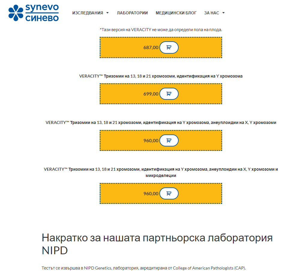 А бодимед също ползват същя тест Veracity като Синево, но няма дадена цена, споменато е, че ги изпращат към NIPD. Като въведох в гугъл NIPD забелязах, че линкът www.nipd.com те препраща към сайта на същата тази фирма Medicover. Явно са ги купили или обединили. За въпроси към Бодимед само пише да се свържеш с тях по мейл и им писах със запитване за цена и коя лаборатория ги пращат.