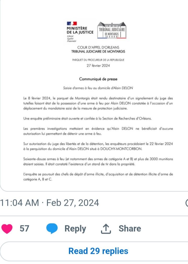 Френската полиция иззела от дома на Ален Делон 72 незаконно притежавани огнестрелни оръжия, иначе човека имал стрелбище в къщи и явно са за това.