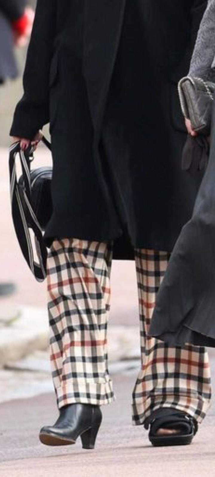 Елена е с карираните панталони. И на мен ми изглежда с различни обувки, но може да е от ъгъла на снимката нещо.