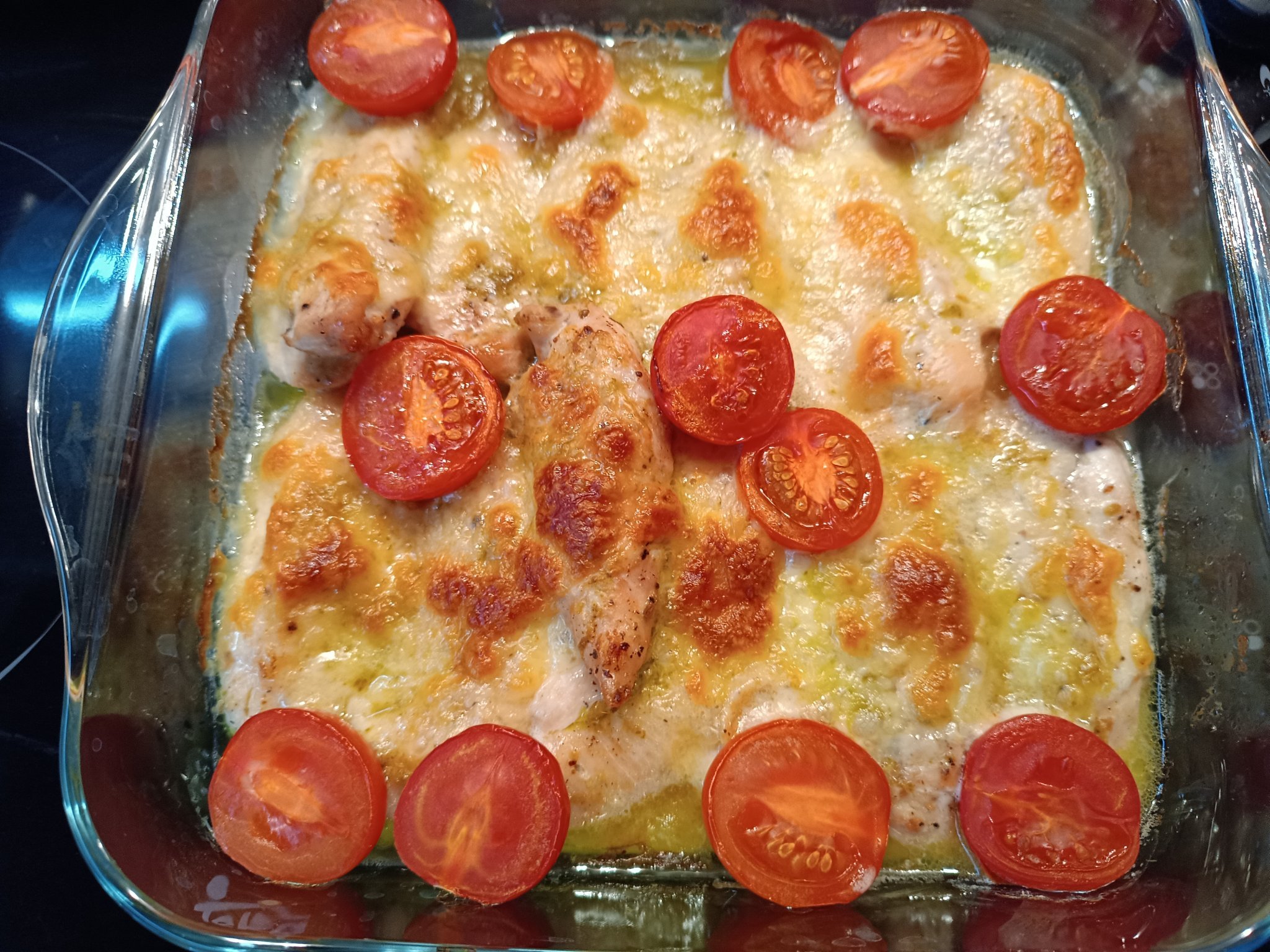 За който иска да сготви пилешкото с песто и моцарела,ей така изглежда в тавата: