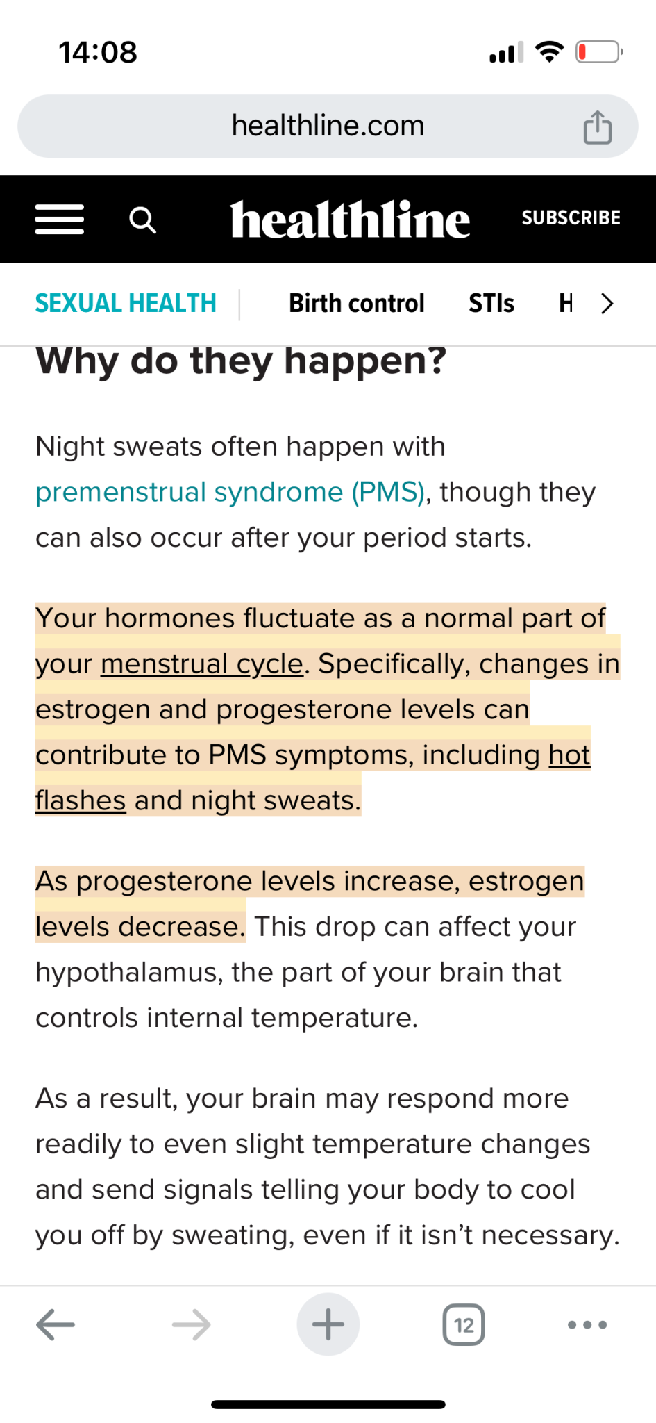 Но ще ти резюмирам - от повишаването на прогестерона тялото на жената е по-топло през ЛФ. Оттам и повишената БТ. Падне ли прогестерона - тялото се охлажда. Как - чрез потене. Точния механизъм на хипоталамуса не го помня наизуст.