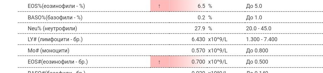 Герито, по принцип повишение може да показва алергична реакция, обаче покажете общите левкоцити, црп и хемоглобин, за да може да кажем нещо. Възможно е повишение при вирус, ако црп-то е над нормите. Или леко завишение от полените, ако црп, левкоцити и хемоглобин са в норма.