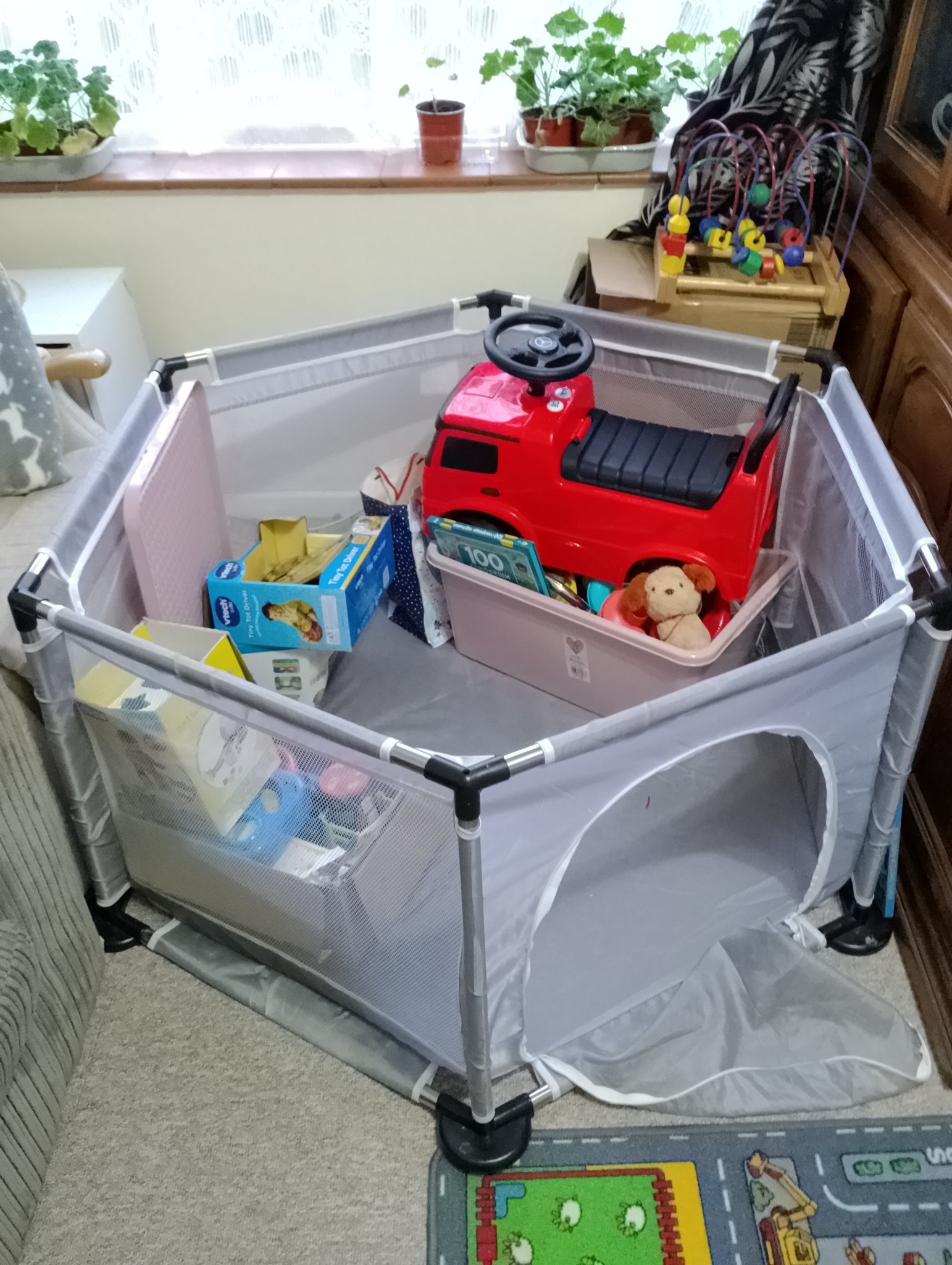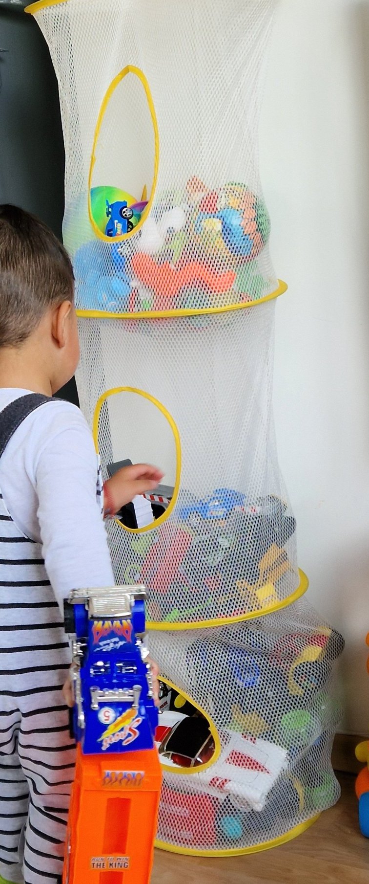 Намерих някаква мрежа събрахме в нея доста от играчките ,Вики си прибира и изважда сам от нея ,има още доста място,но по-големите играчки не могат да влязат там такаче ще си стоят в коша за сега