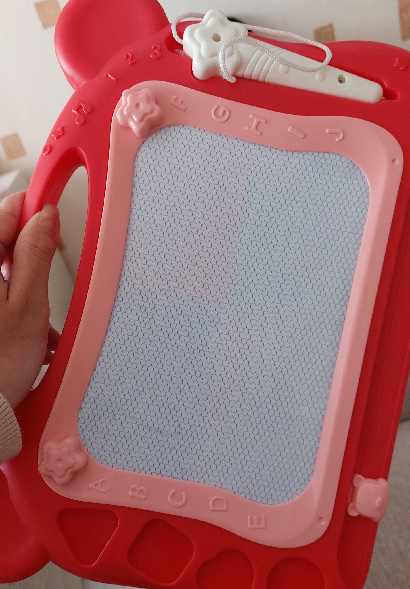 Моето Плами има подобна дъска като на Ади и  пише на нея. Не ми дава възможност да и покажа каквото  и да е,да рисуваме нещо😂Има фулмастери,пастели с които пише и бои даже с които скоро ще драскаме. Обожава да пиши. Стените в нас вече са цветни 😂Не може да казва рисува и повтаря само “пиши”. Играе си с пъзели,сортери и тя обожава книжките(и то много) и всякакви дивотии. То май всички деца сега са на тази вълна. Доста започна да повтаря,да бърбори. Да са ни здрави☺