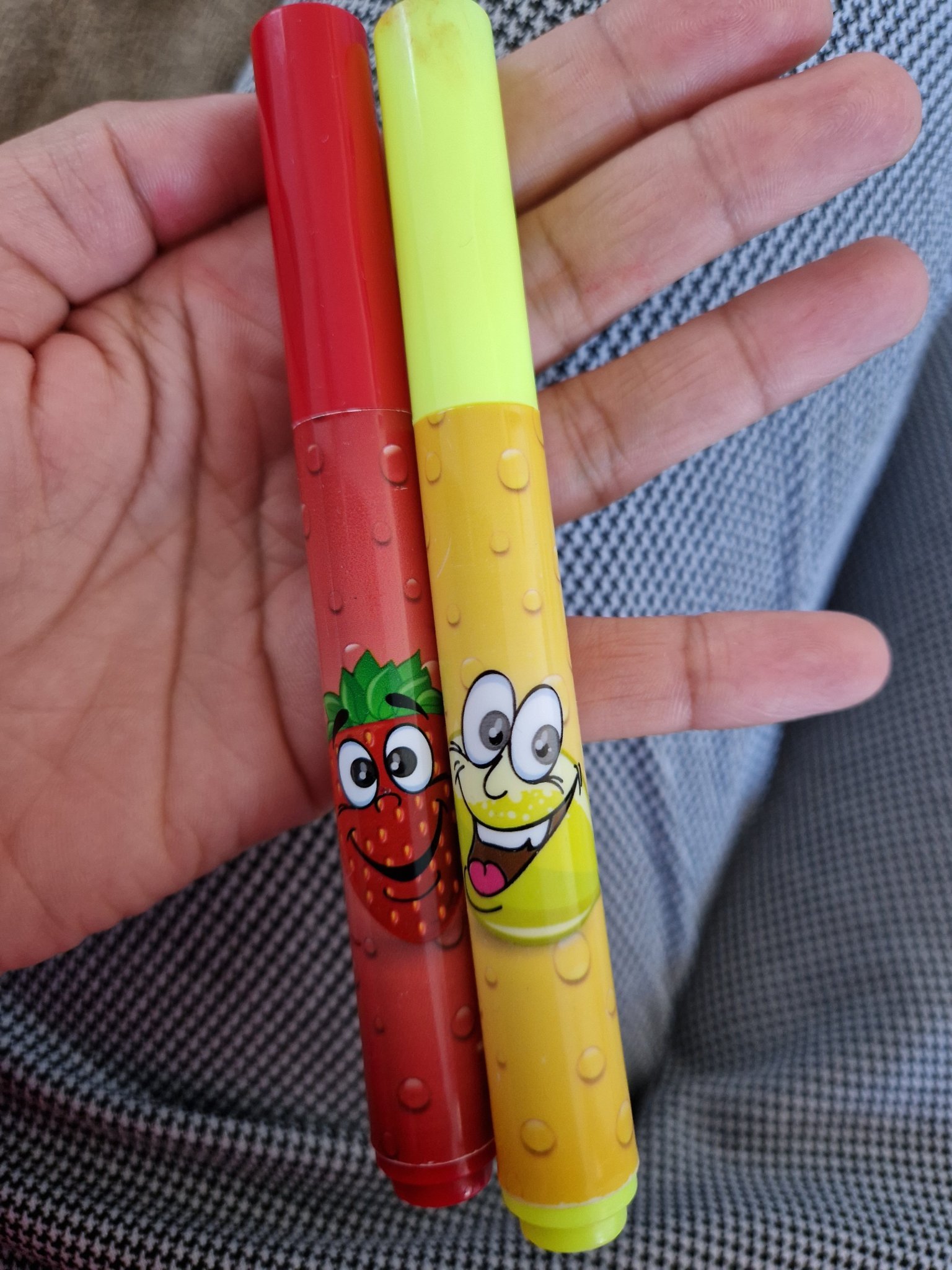 Момичета да ви похваля едни фломастери от Пепко струваха около 3 лв , когато ги взимах не знаех,че са такива,но миришат на разни плодчета и се перат много лесно наистина ,все едно не е имало нищо по дрешката или килима включително стените ,в комплект са около 10бр ,но намерих само тези двата останалите са под дивана най-вероятно 😅