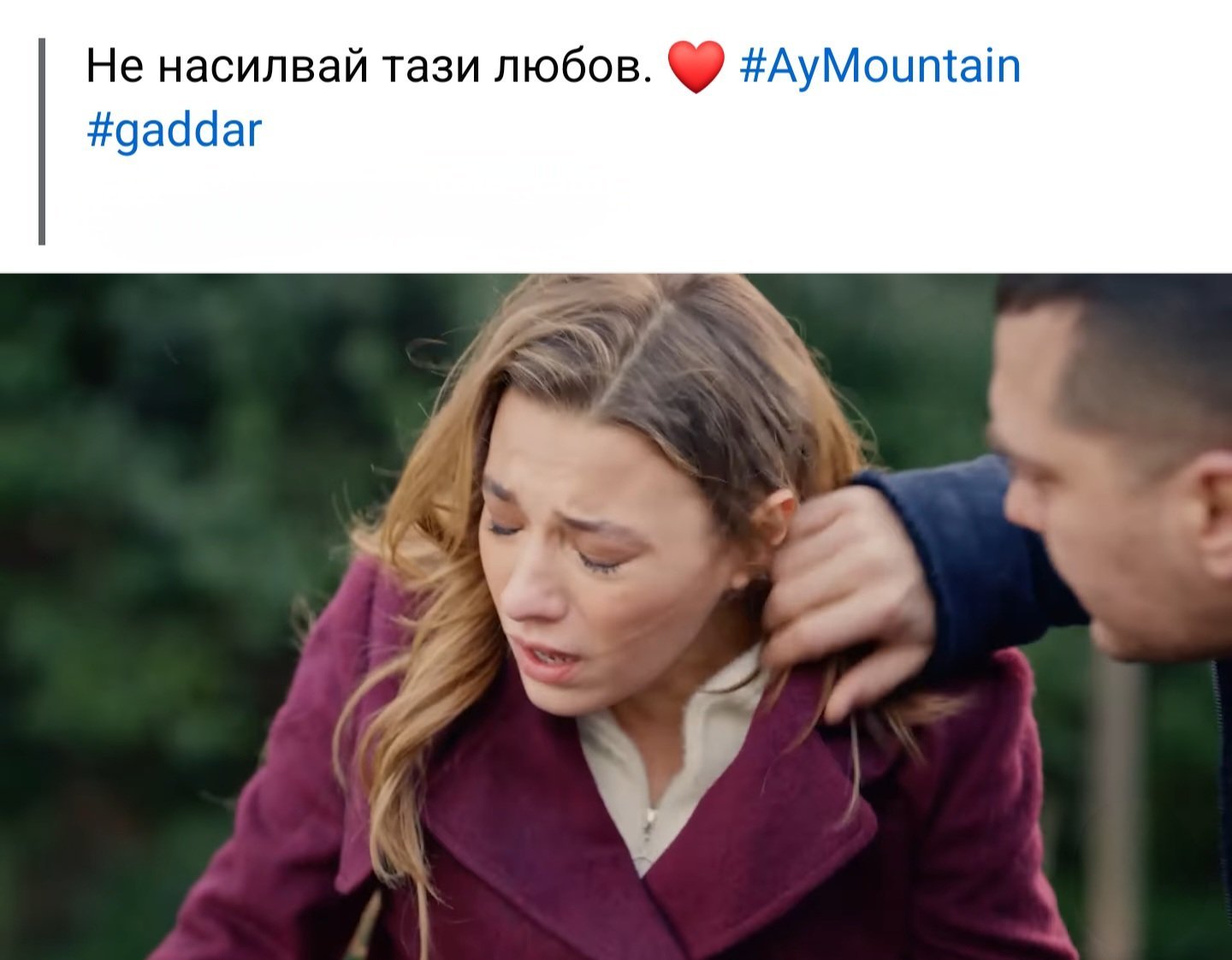 Тази любов никой не я насилва. Всъщност до преди 4 серия всички си мислеха как те са се събрали и имаха други очаквания от тях. Сега май само един човек вярва в любовта им освен Айдън. Дахан не иска да говорят, не му разбирам съображенията. И без това беснее, може да я изслуша, пък да се свършва. И тя няма да го преследва повече. Според мен тя не му казва всичко още, но да видим. Той много се инати, тя не е от най-спокойните, направо си е сприхава. И не могат да се разберат. Кажат си две изречения и почват със скандалите и обидите. То затова са казали, че едно от най-важните неща в една връзка е говоренето/споделянето. Имат 9 серии да си кажат всичко.
