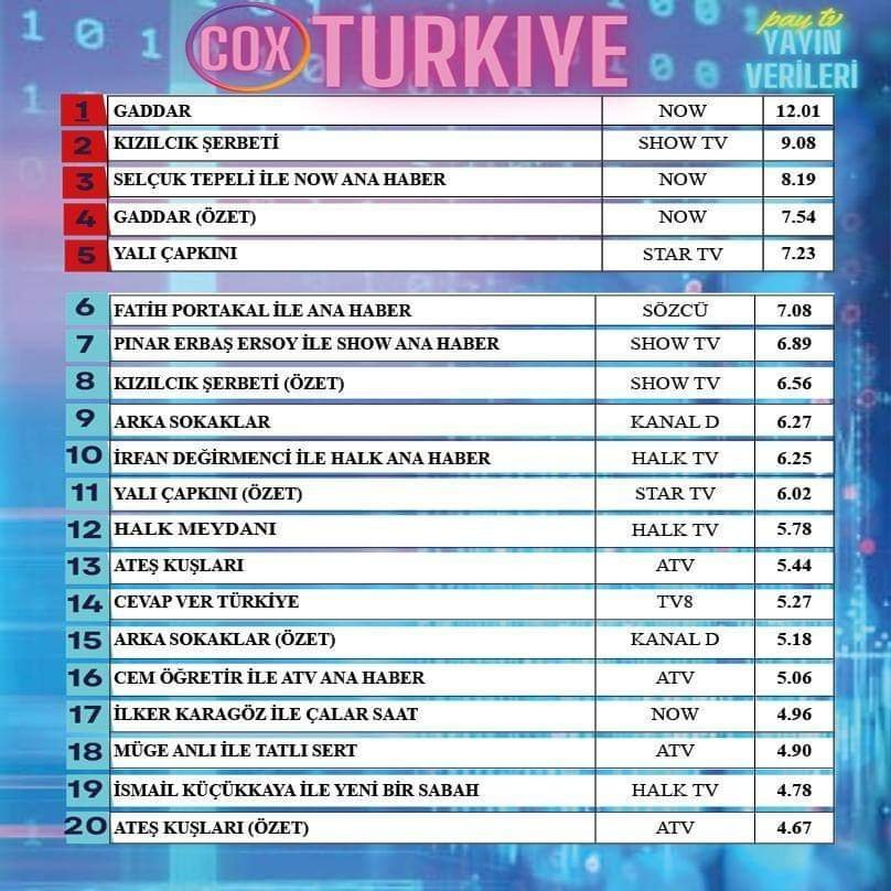 💥Според COX TURKIYE снощният епизод 5 на Gaddar е пред всички със стойност 12,01.  👏👊♥
