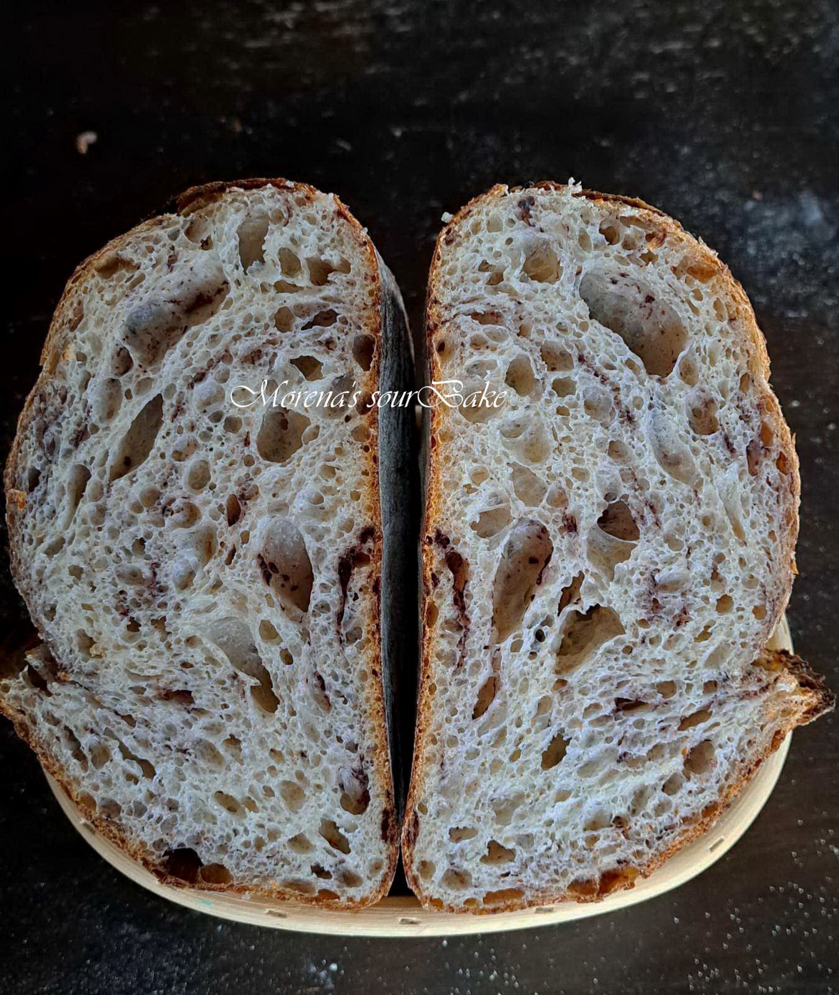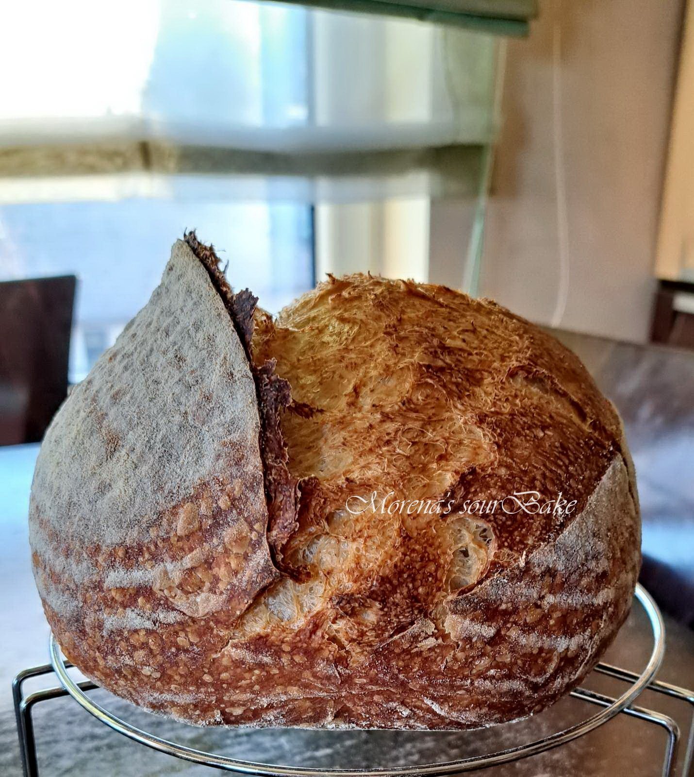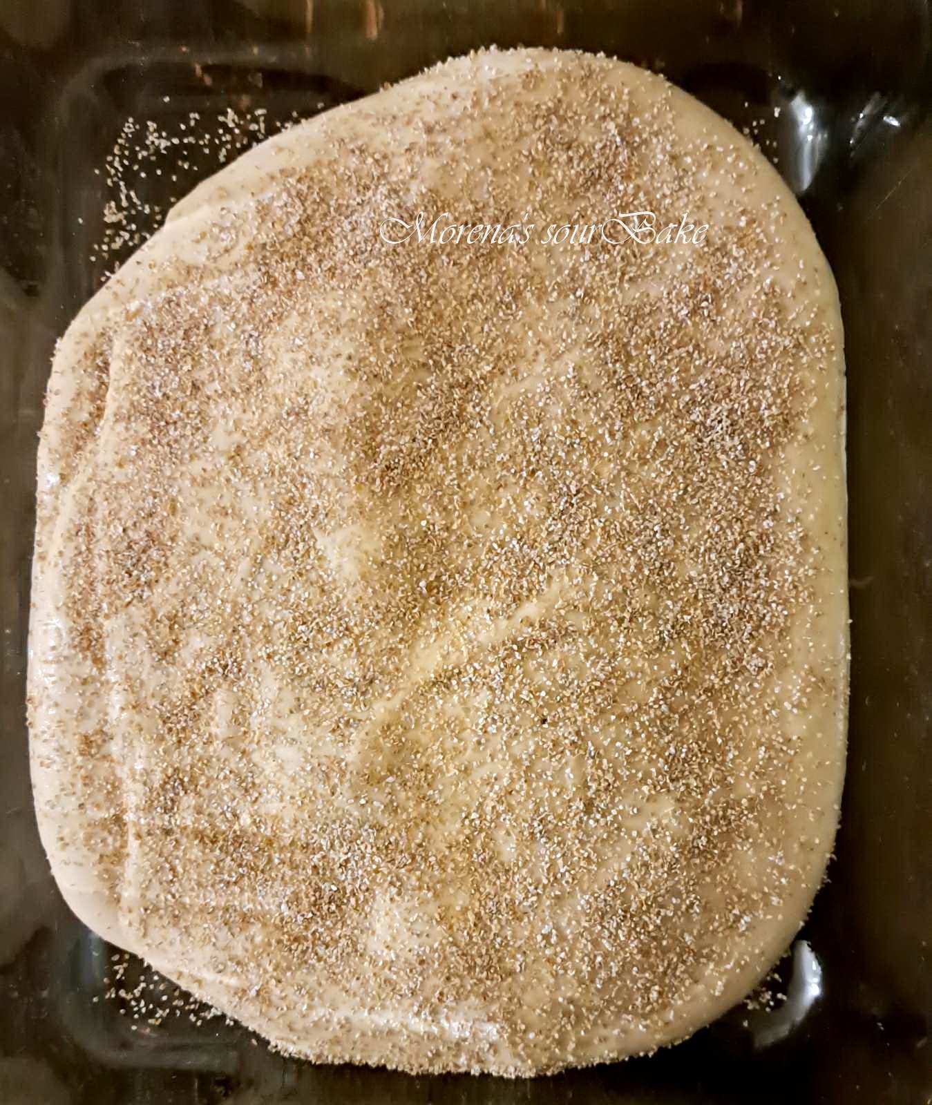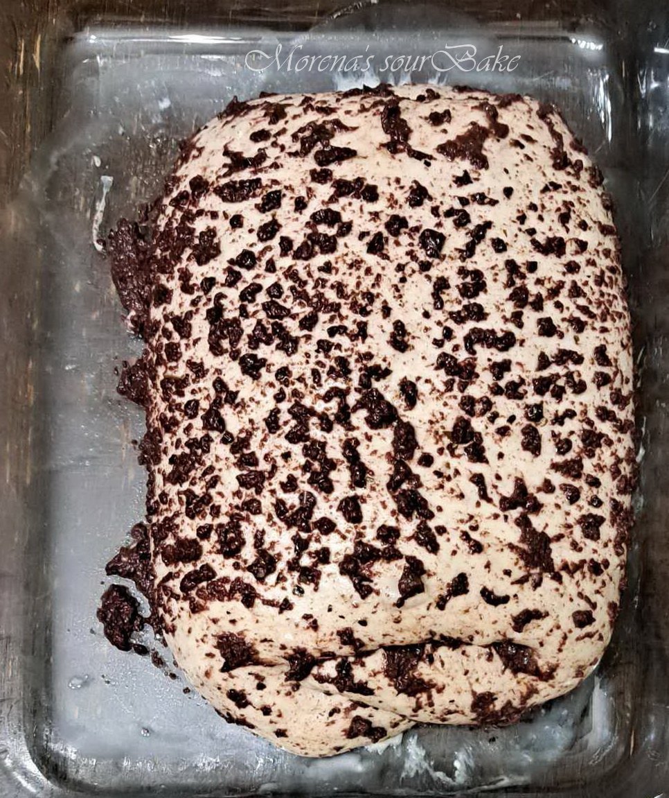 Автолиза за 2.45часа със 78% студена вода. Квас, сол с малко вода. 2 разтягания и сгъвания и 7 вътрешни сгъвания, като последните две - половинки и оставих да втасва на плота.  Оформих след 10 часа насипна ферментация, защото беше късно да го чакам повече, а имаше нужда...  Забавената/ хладилна ферментация е 39 часа.