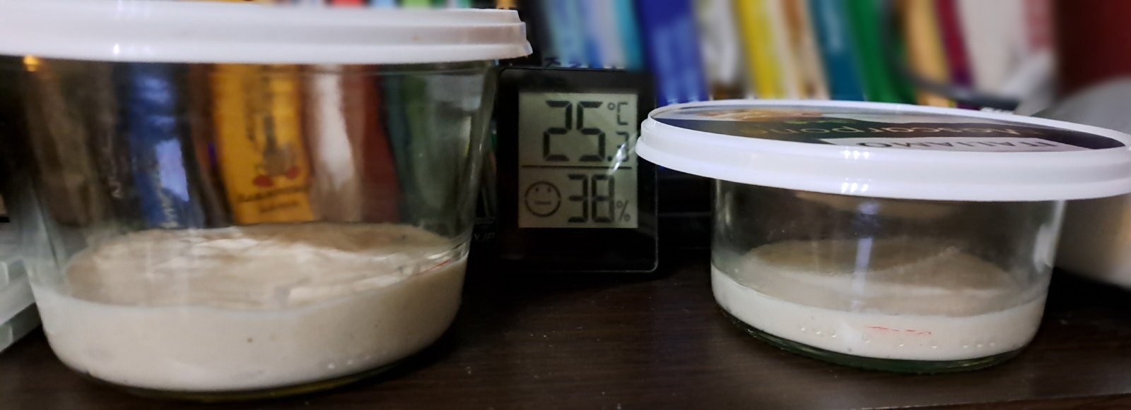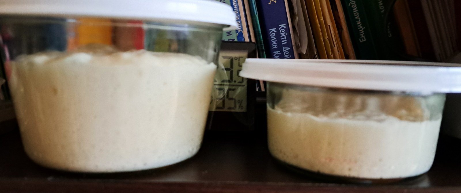 Ето ги и двете, в момента (22.30ч.) - в дясно квасът, в ляво Закваската.  Тъкмо ще имам време за накаква Автолиза. Simple Smile
