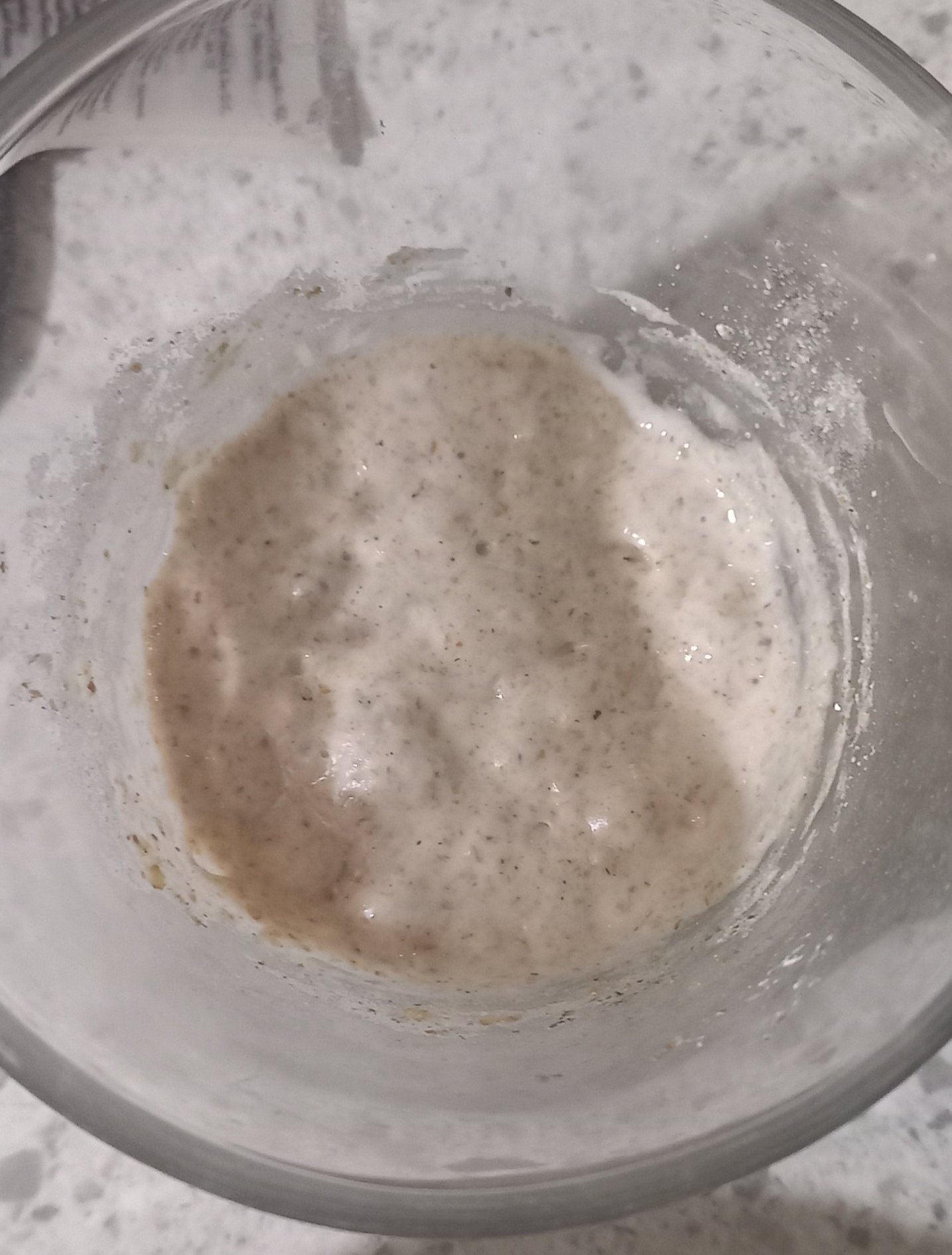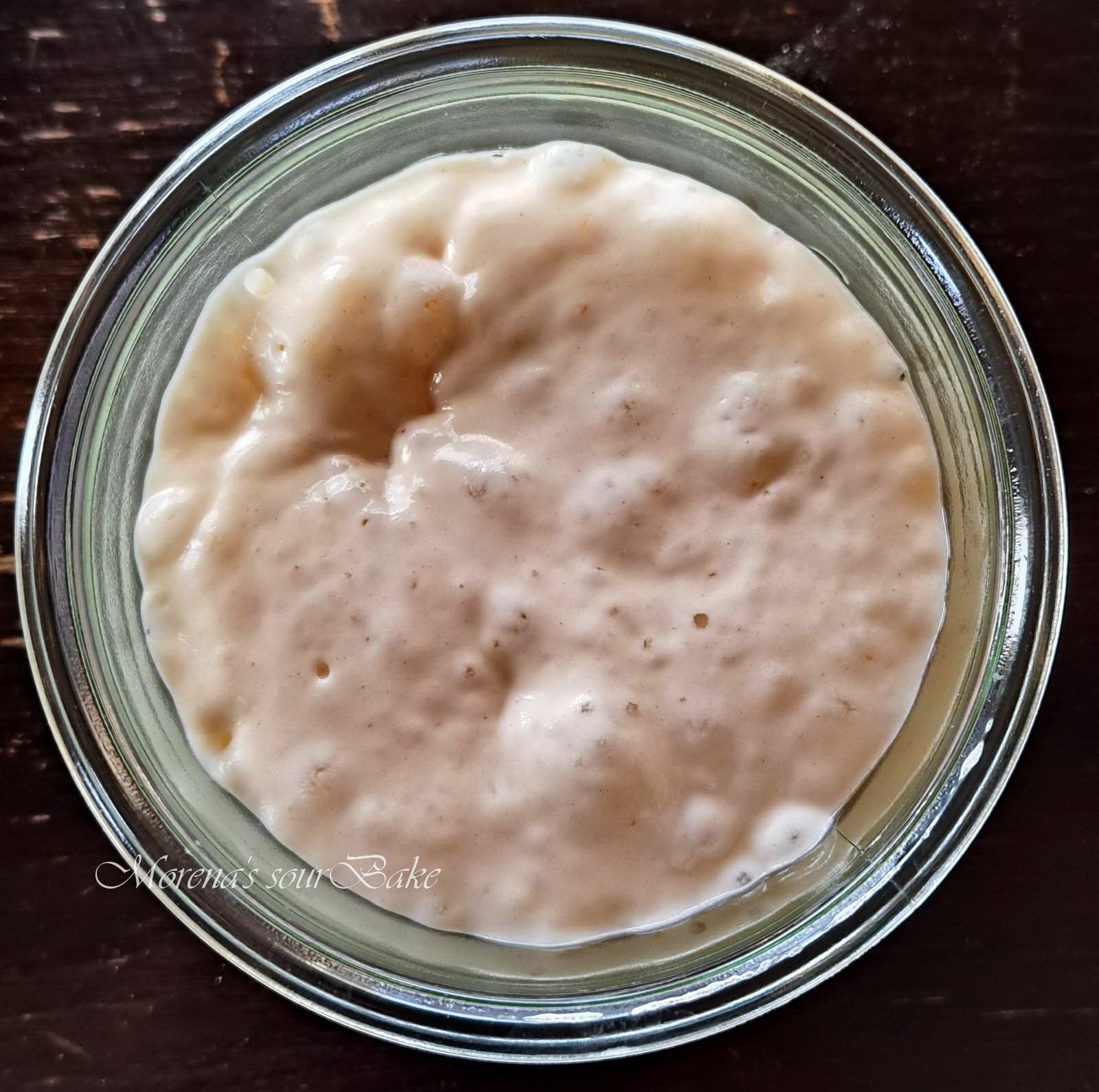 Ето и заквската отгоре - готова за влагане - повърхността е изравнена и хлътва.  Следва спадането, което е добре да не се допуска. Simple Smile