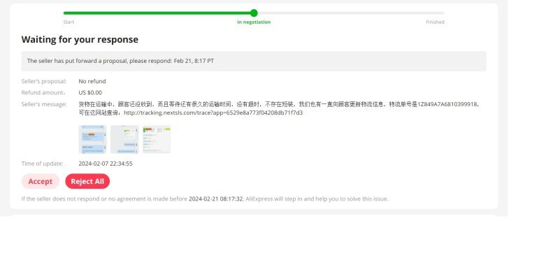 Нямам опит и не знам историята, но ми се струва най-удачно да кликнеш на синия ред и да апелираш за помощ към платформата за търговия, самия Алиекспрес.