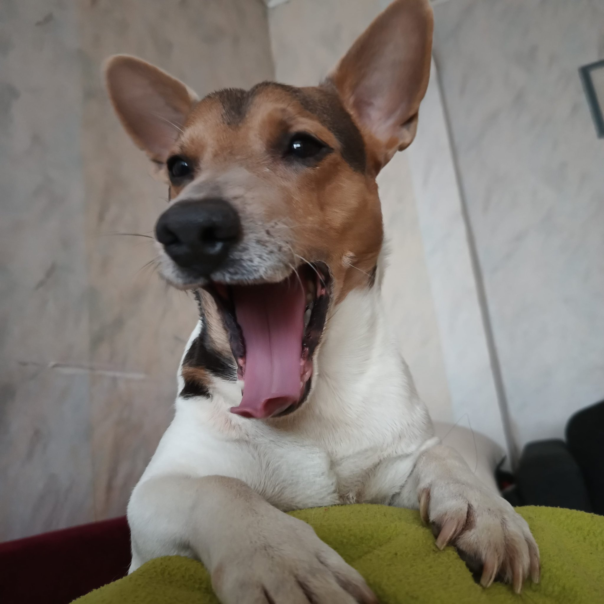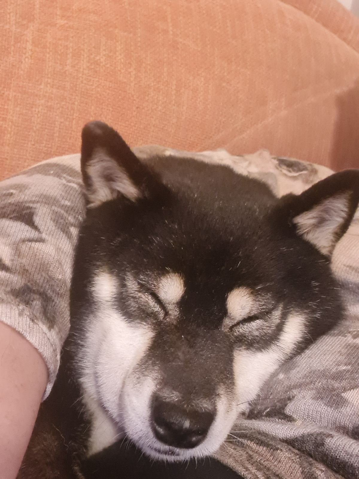 Едно щастливо куче, което спи дълбоко и даже похърква. Защото е победила най-омразния си враг лаптопа и се е натикала възможно най-много в мама. Simple Smile