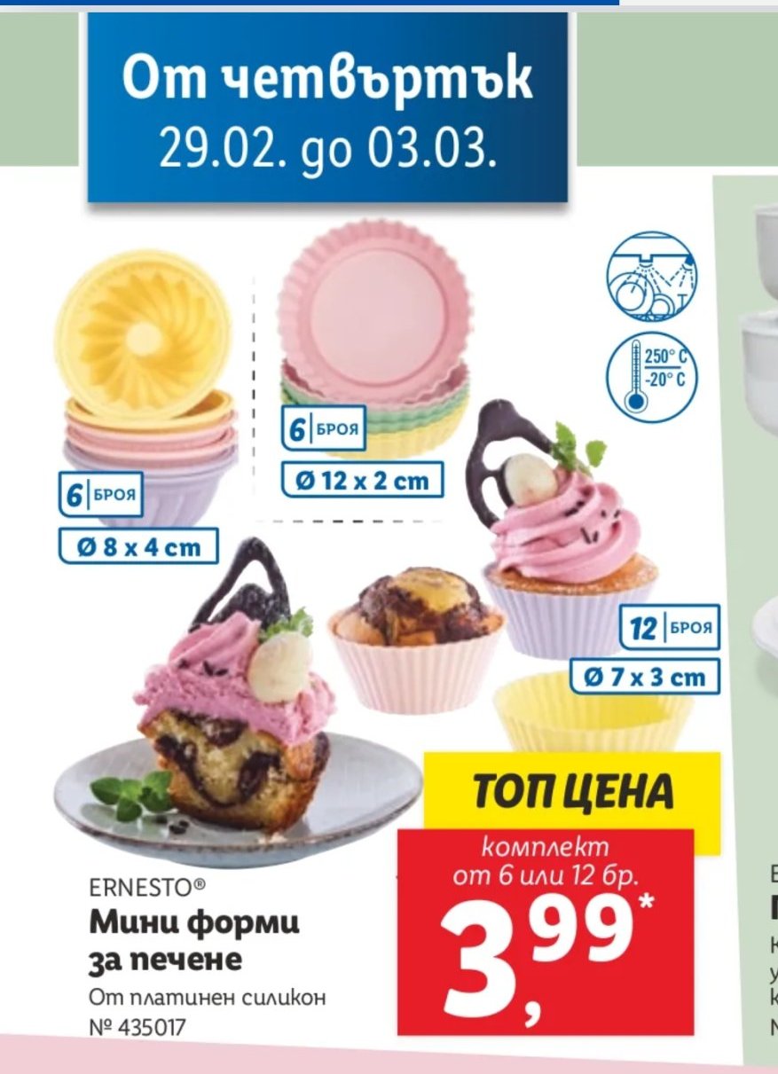 От четвъртък в лидл,изгодни и хубави са,аз имам от предно пускане мъфини и за понички,сега ще опитам да взема за тарталети,дано има като стигна до там.