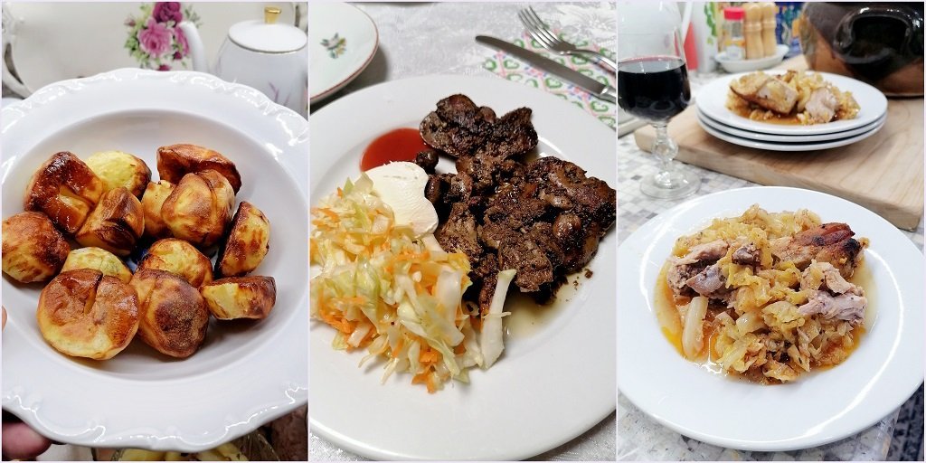 Картофи във фрайъра, дробчета в тиган и кисело зеле с рагу, сланина и свински бут в гювеча