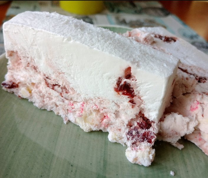 Сладолед с вишнево сладко,бял шоколад и натрошени целувки