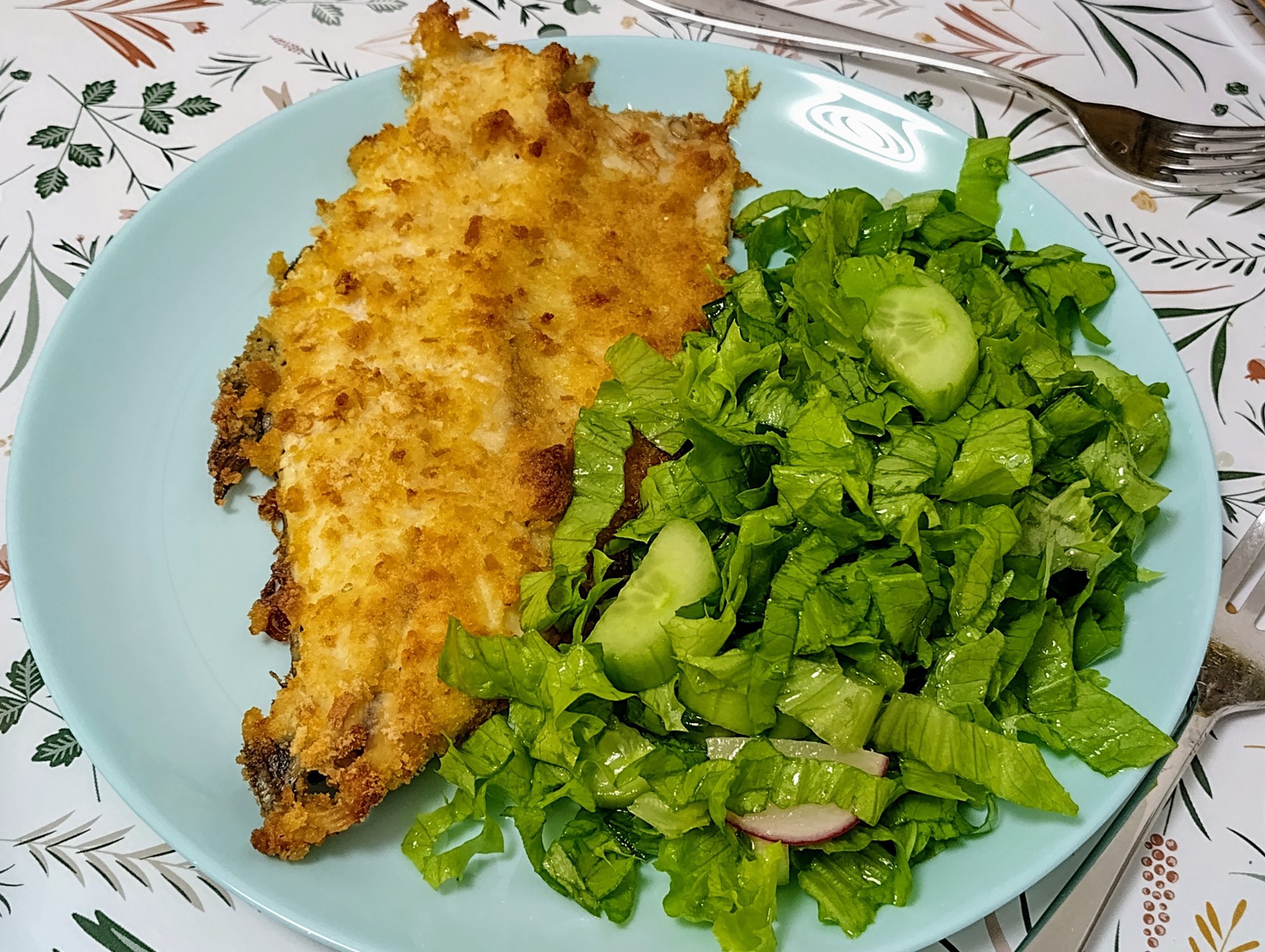 Филе от пъстърва с панировка от печени трохи, зехтин, яйце и лимон на фурна