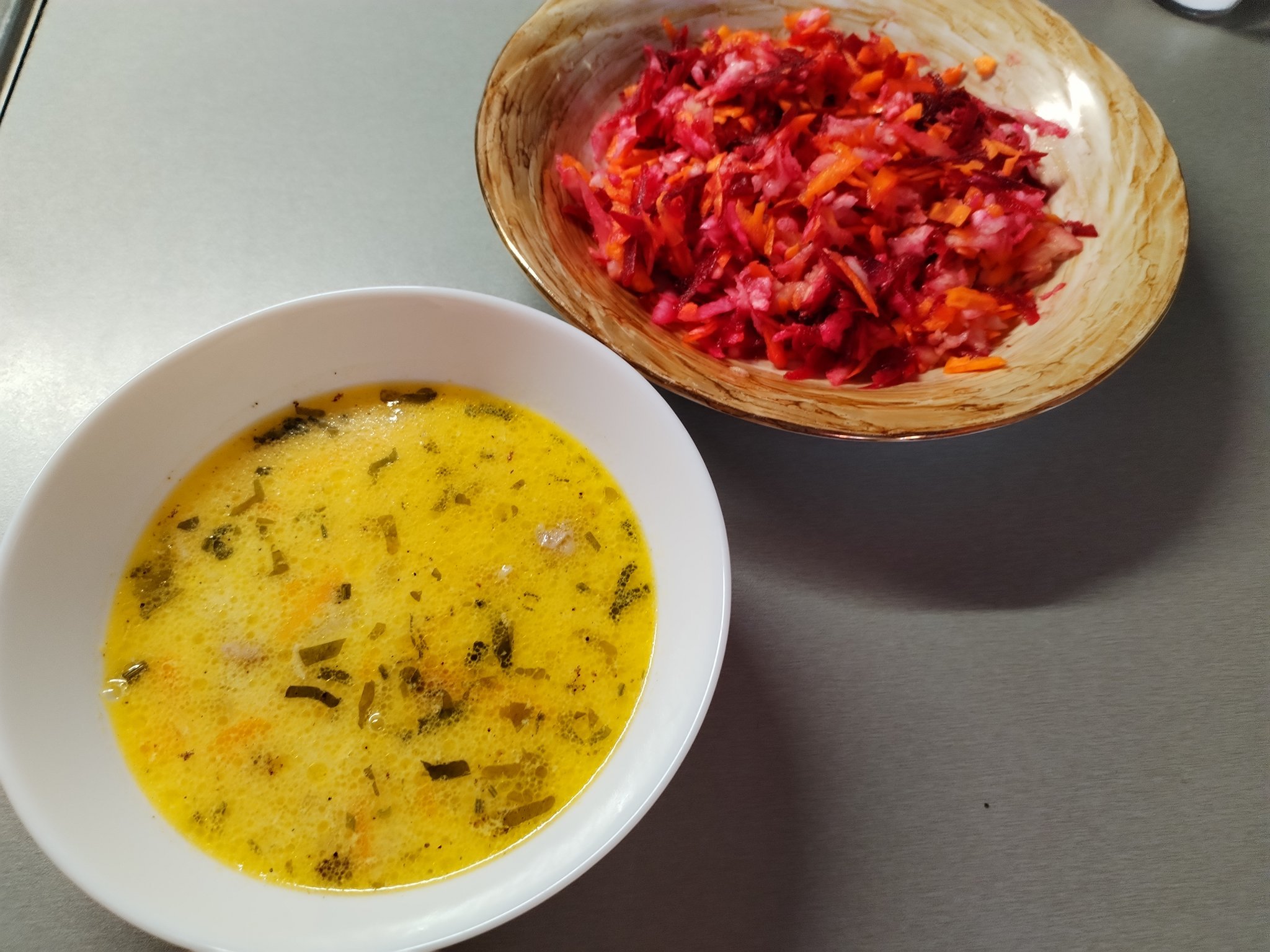 Пилешка супа със салата витамина .Палачинка с мед и орехи.