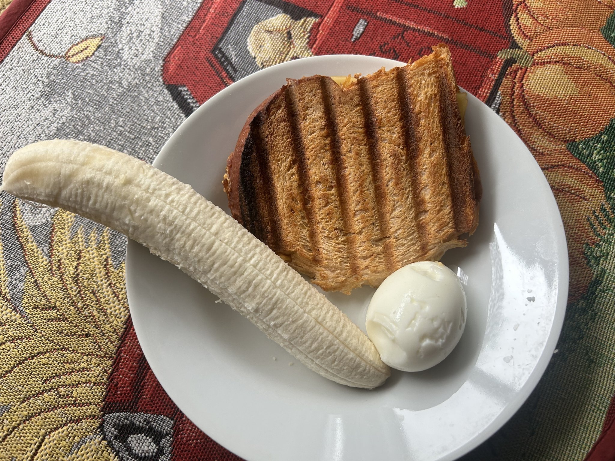 Бърза закуска за ММ - грилован сандвич с песто, чедър и хумус, яйце и банан.