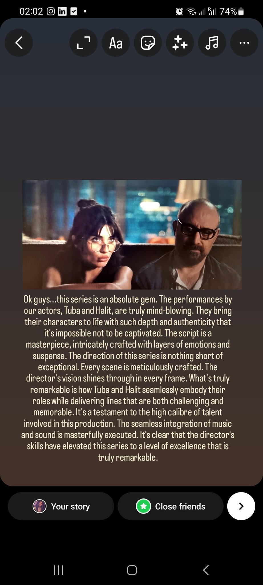 Умопомрачително изпълнение на Туба и Халит. Отлична работа, като се започне от режисурата на сериала, продукцията, музиката и нашите отлични актьори, които запомниха твърде много реплики, докато се представяха безупречно и без усилие с такъв висок калибър