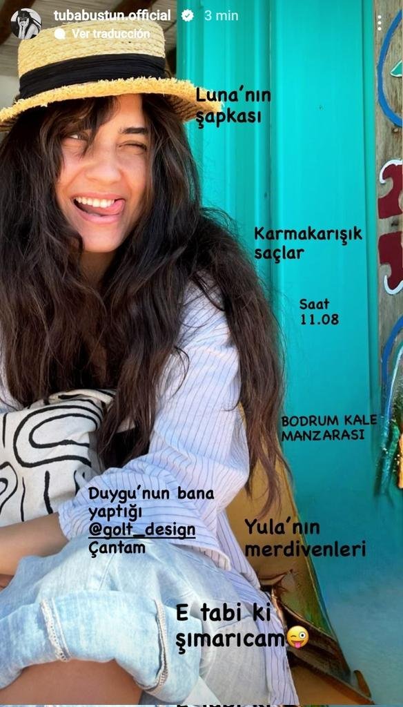 Туба все още публикува красиви ваканционни снимки, „разрошена коса“ или не. Смразяващо...прекарване на време с нейния приятел Дуйгу. Препратка към Yula Bodrum, малък плажен бар със страхотна гледка към замъка Бодрум и морето. Тя е публикувала от тук и преди. Носи страхотна ръчно изработена тъкана чанта, проектирана от нейна приятелка. Тя казва, разбира се, че съм разглезена…