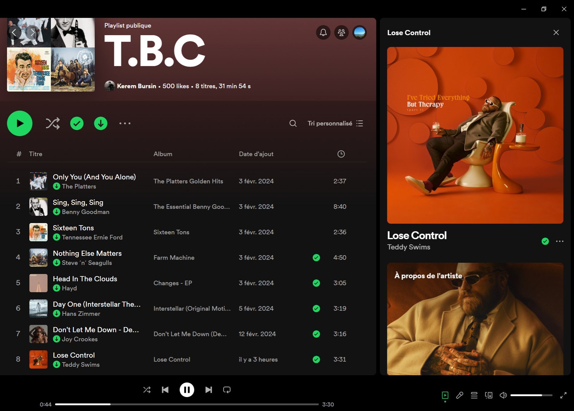 Днес Keрем e добавил нови песни към плейлистатa T.B.C. в Spotify