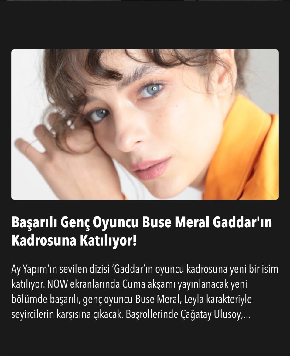 Başarılı Genç Oyuncu Buse Meral Gaddar'ın Kadrosuna Katrlıyor! Ay Yapım'ın sevilen dizisi Gaddar' ın oyuncu kadrosuna yeni bir isim katrlıyor. NOW ekranlarında Cuma akşamı yayınlanacak yeni bölümde başarılı, gengoyuncu Buse Meral, Leyla karakteriyle seyircilerin karşısına çıkacak. Başrollerinde Çağatay Ulusoy, Sümeyye Aydoğan, Onur Saylak, Alper Çankaya ve Erdal Özyağcılar'ın yer aldiğı Ay Yapım imzalı 'Gaddar'ın bu haftaki bölümüne Buse Meral katılyor. Dağhan'ın karşısına sürpriz bir sekilde çıkacak Leyla'ya hayat verecek oyuncunun karakterinin dizide dengeleri nasıl değiştireceği şimdiden merak yaratıyor