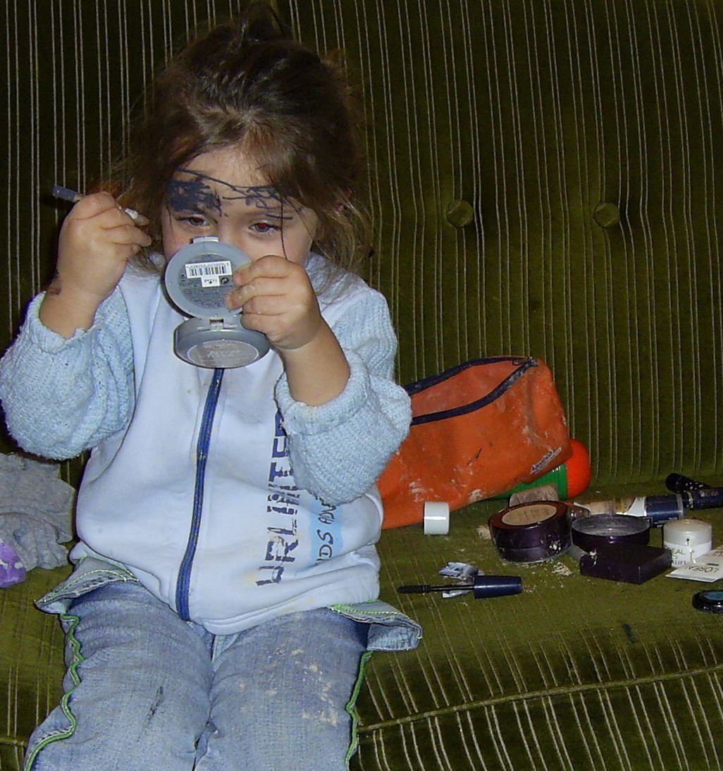 Вече не помня за какво, но веднъж си бях извадила несесера, може да не слагам често грим, но имам всичко. Тя бутна и счупи нещо в другата стая, скочих по спешност да почистя преди да се е подхлъзнала и пребила/нарязала. Докато се върна се беше направила на прасе със спиралата ми и беше яла от перлите. Ппочистването на кожа, дрехи, диван и килим ми отне близо час. Да, моя си е грешката, че ги оставих на достъпно място, но когато гази в стъкла мозъкът ти се насочва натам. Повече не го извадих, всеки си избира битките.