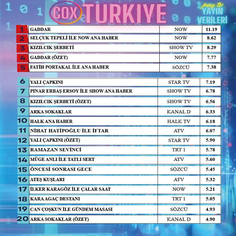 Рейтинга не е никак лош със зелени стрелкички сме .. може още повече и заслужава след качеството и спиращи дъха сцени и актьорска игра. От тук нататък ще вървим нагоре с цифрите .. Иншаллах . Hands Pray ' Екшън драмата 'Гаддар'' има аудория и се вижда и личи. Ако не дръпнем поне да запазим тези цифри докрай е постижение . Конкуренцията.... ''Шербета'' е нанедаминат ,  ''Чапкъна'' се е повишил , но с тези резултати сезон 3 може и да няма .. Преди бяха с рейтинг 15 и с глупости, локуми и смяна на сценаристи непрекъснато и спаднаха надолу ..