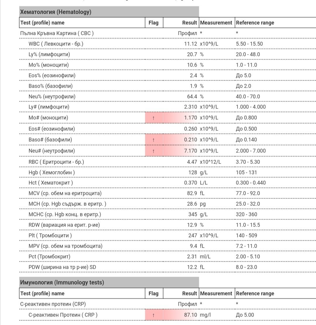 Това е за антибиотик, нали? Интересното е, че температурата спадна, обаче днес това са резултатите от кръвната проба. Личната ме остави сама да преценя, предписа антибиотик, ако е високо ЦРП да давам. Ама ако няма температура да задържа. Да, ама тя такова високо црп не е имала до сега. Ох, ще търся дежурни лекари някакви май.