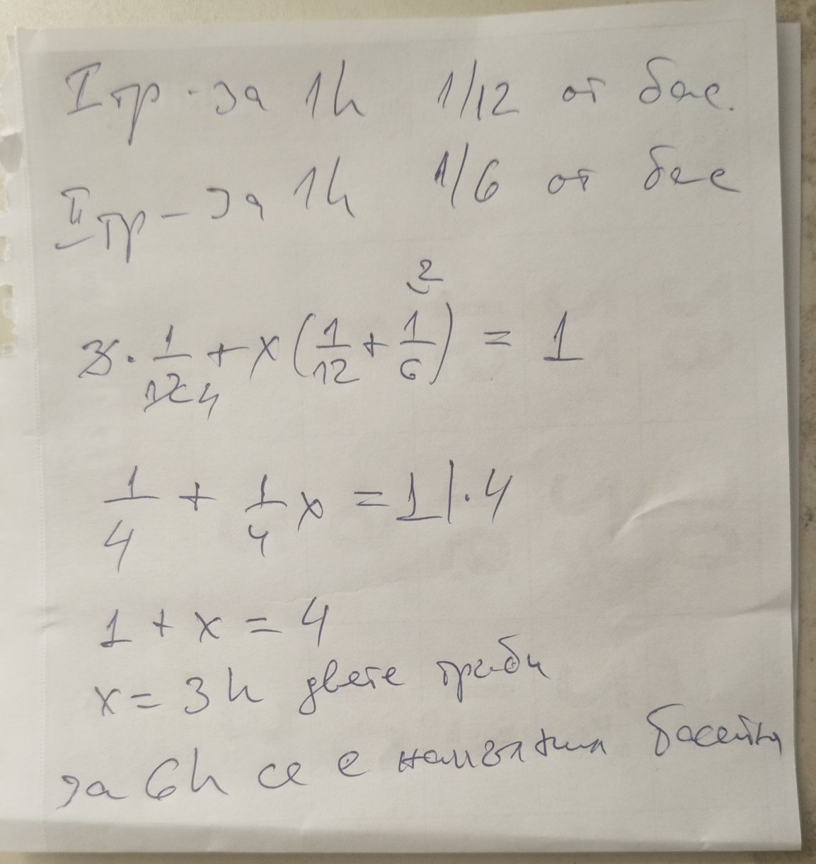 Една тръба може да напълни един басейн за 12 часа, а друга-2 пъти по-бързо.Първата тръба работила сама 3 часа, а след това отворили и втората. Басейнът се е напълнил за?