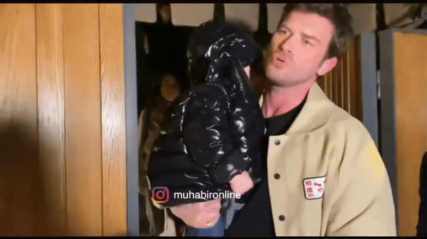 Той учтиво поздрави журналистите, но помоли да не снимат и да не задават въпроси, тъй като е с изморено дете на ръце. Обеща да поговорят по-късно и им благодари за разбирането