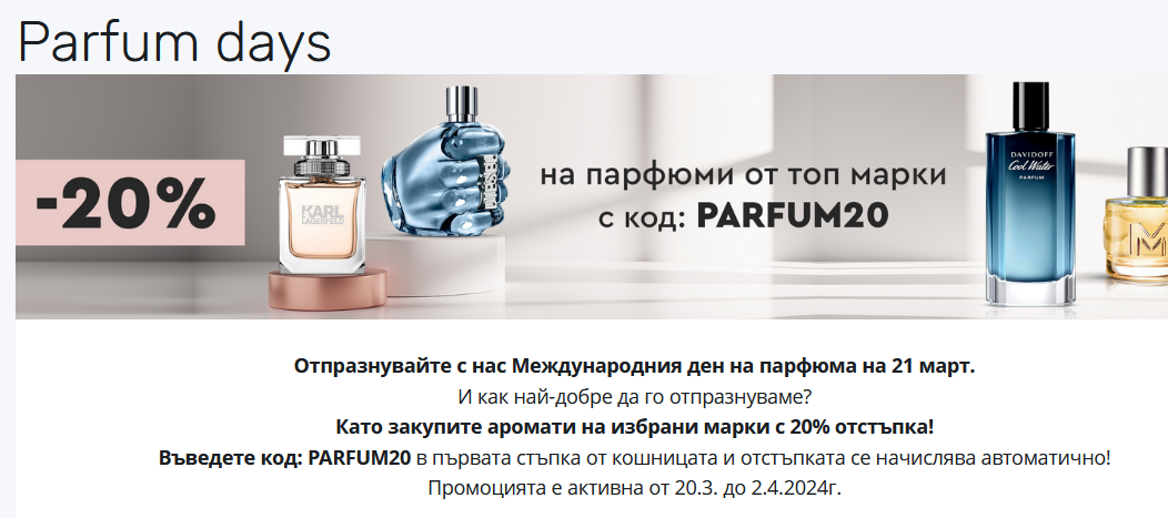 Доста време е ,да  Sad . Предлагат нишови парфюми,на добри цени според мен.Когато имат код.Ниш не ползвам ,освен Монтал и Мансера,от скоро.Чисто финансово Simple Smile,не мога да си ги позволя. Дано ви пристигнат парфюмите.