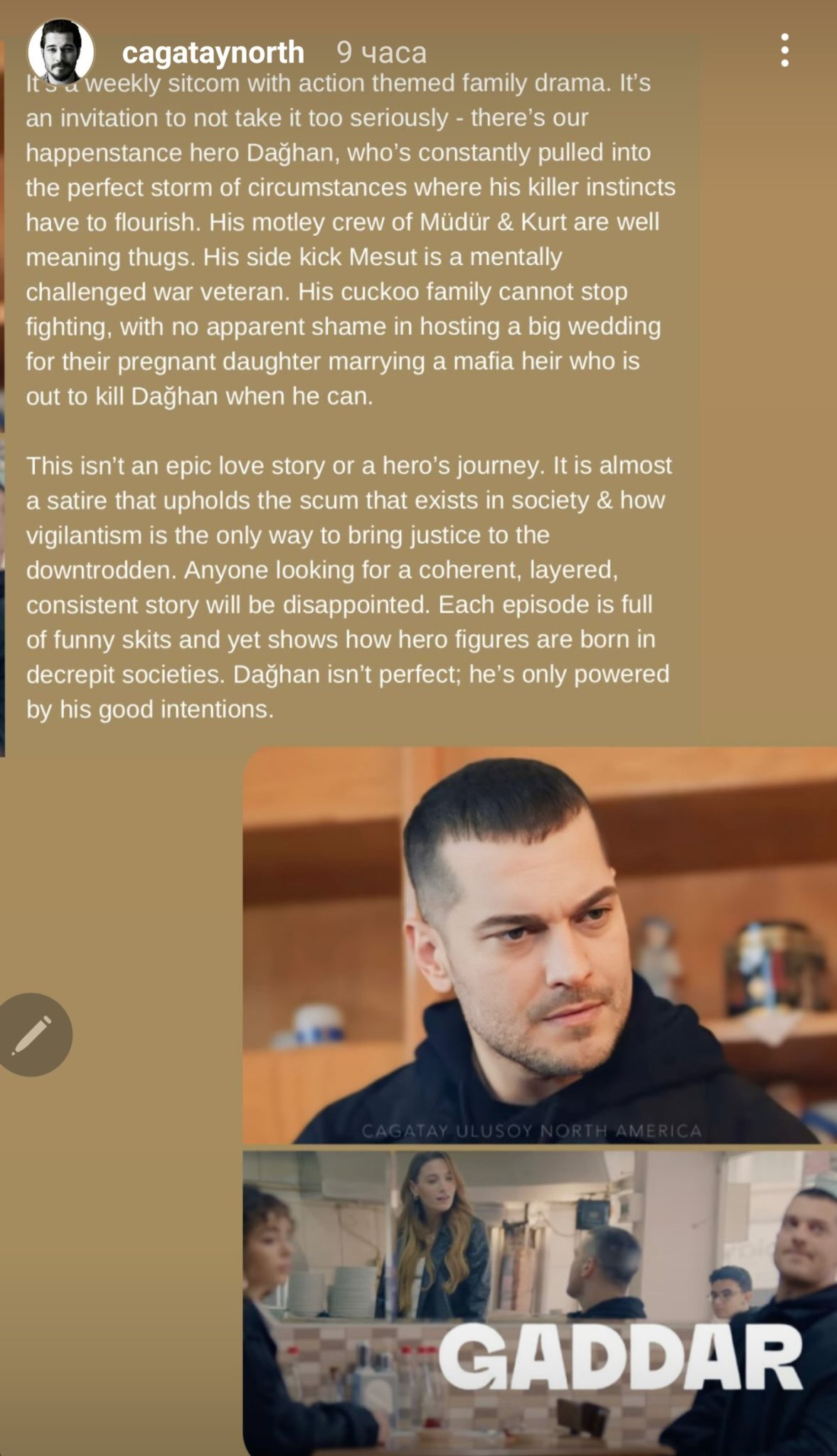 "Това е седмичен сериал със семейна драма на тема екшън. Това е покана да не го приемате прекалено на сериозно – това е нашият случайен герой Дахан, който непрекъснато е въвлечен в перфектната буря от обстоятелства, където инстинктите му на убиец трябва да процъфтяват. Пъстрият му екип от Müdür & Kurt са добронамерени бандити. Неговият страничен удар Месут е ветеран от войната с умствени проблеми. Неговото кукувиче семейство не може да спре да се кара, без видим срам да организира голяма сватба за бременната им дъщеря, омъжена за наследник на мафията, който е на път да убие Дахан, когато може. Това не е епична любовна история или пътешествие на герой. Това е почти сатира, която поддържа изметта, която съществува в обществото и как бдителността е единственият начин да се въздаде справедливост на потъпканите. Всеки, който търси последователна, многослойна последователна история, ще бъде разочарован. Всеки епизод е пълен със забавни скечове и все пак показва как фигурите на героите се раждат в западналите общества. Дахан не е съвършен, той се захранва само от добрите си намерения."