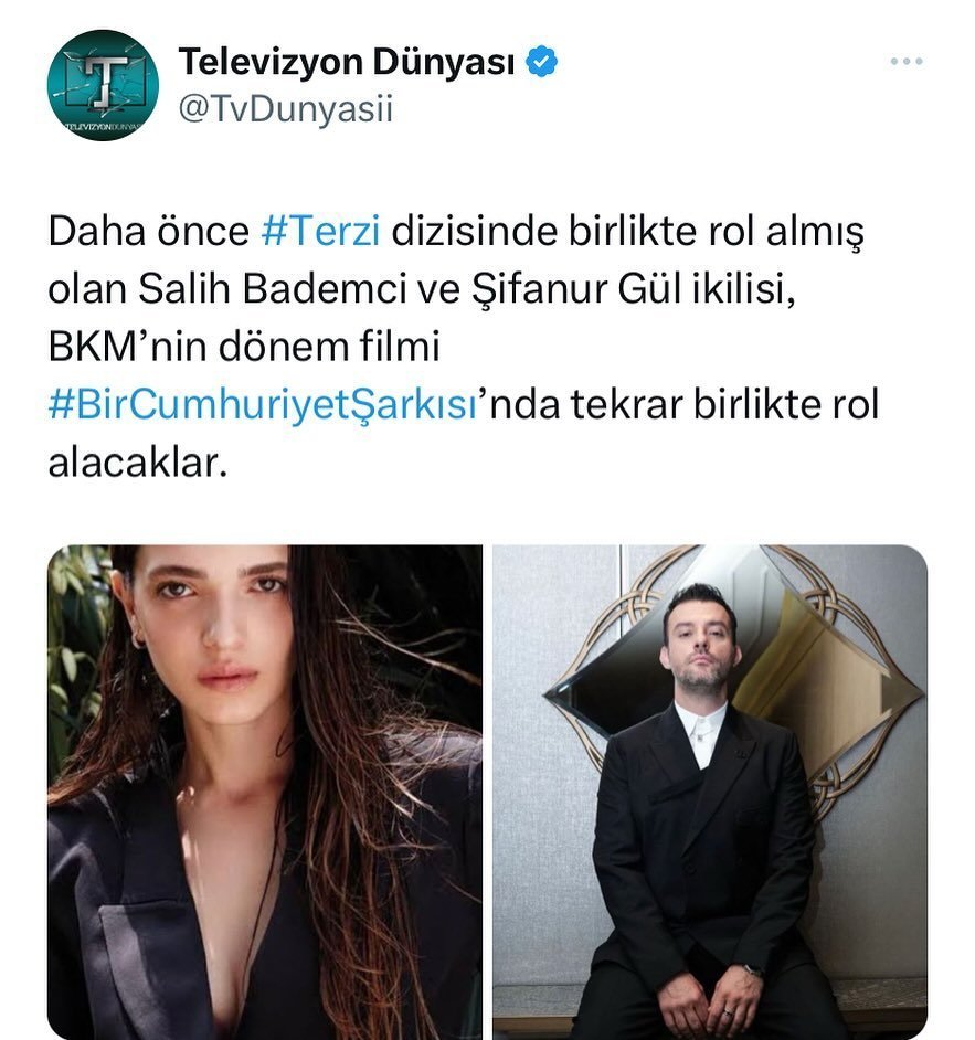 Дуото Салих Бадемчи и $ifanur Gül, които преди това са участвали заедно в сериала Terzi, ще участват отново заедно във филма от периода на BKM #BirCumhuriyetSarkısi.
