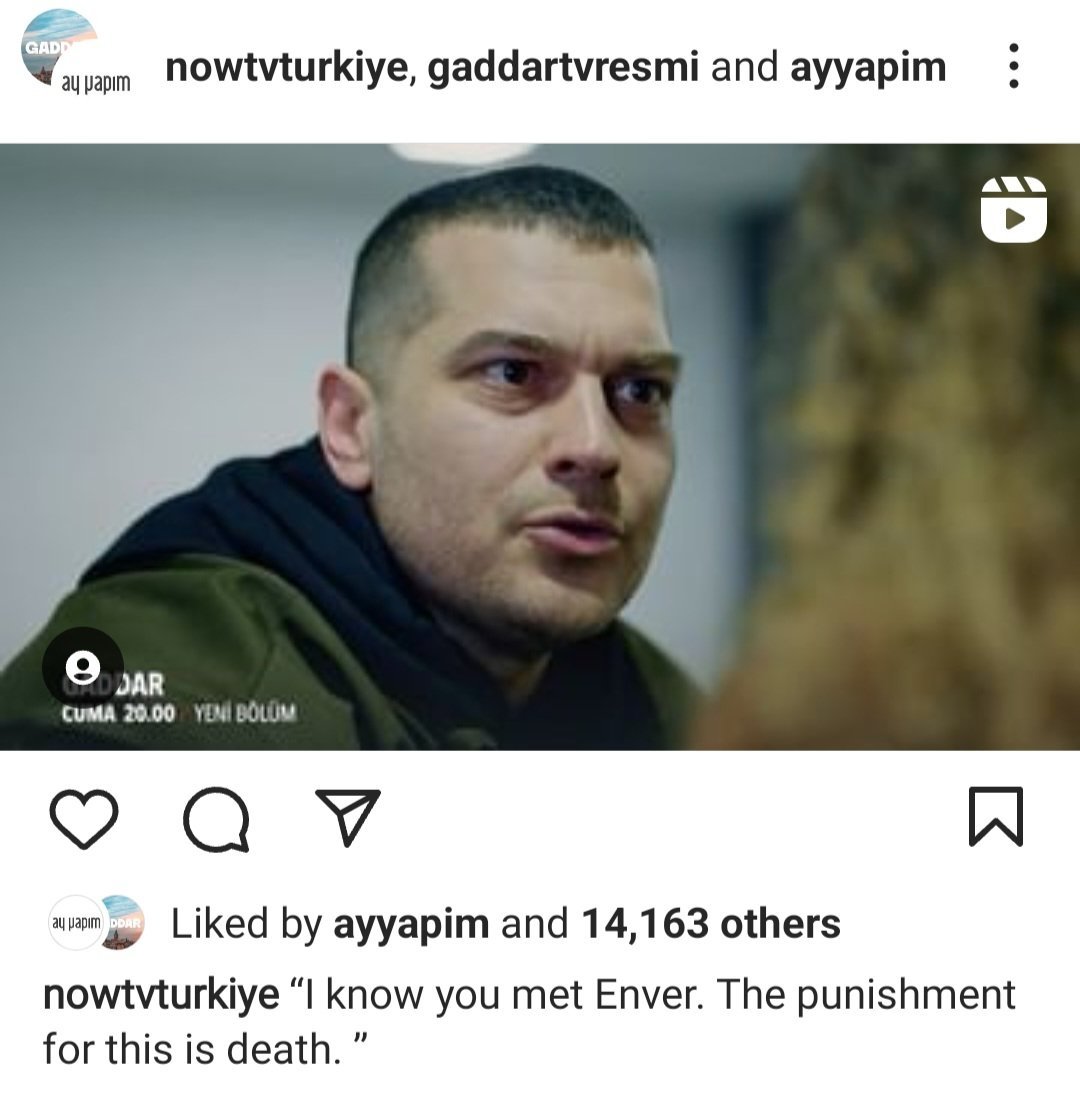 В Инстаграм това накрая го пишат като "Знам, че си срещала Енвер. Наказанието за това е смърт". Не го чувам дали наистина споменава името му и защо така го пишат? И защо ще я наказва, че е срещала Енвер...