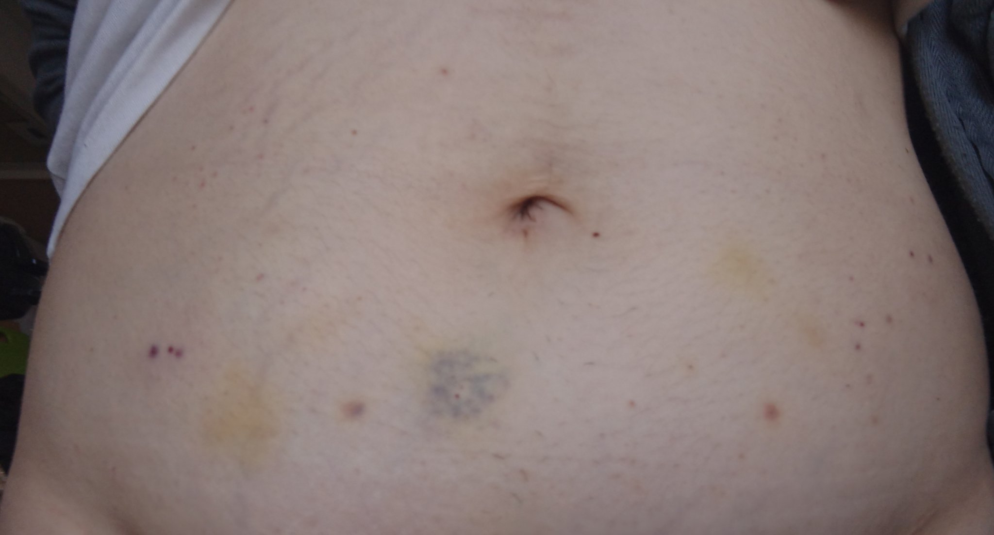 Аз при последния си трансфер доста зор видях с боденето. Пукнах кръвоносен съд единия път, един месец ми седя синината и смени всички възможни цветове. Това беше ден-два след появата ѝ и пак не си личи колко тъмна беше: