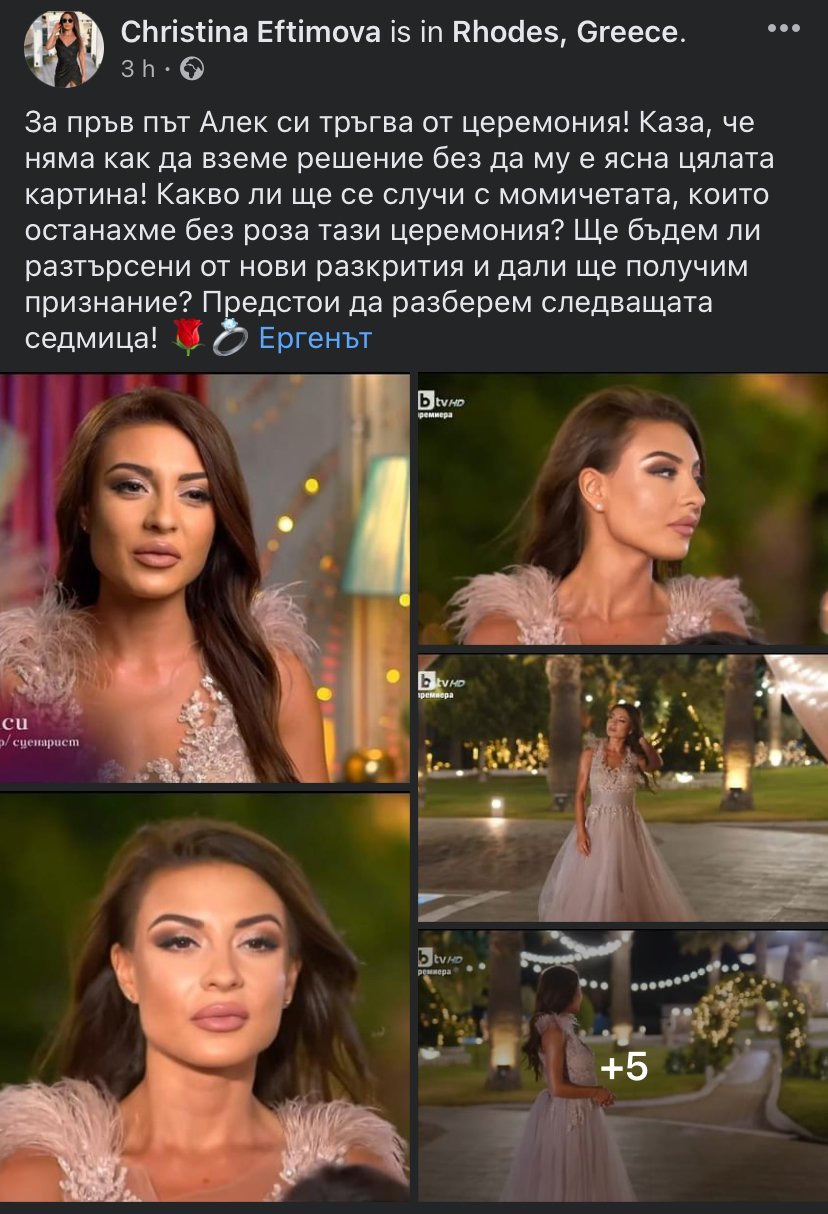 Очаквано и нормално Алек (или продукцията) остави последни и без рози момичетата, които го натовариха, говорейки прекалено много за останалите, при това в тяхно отсъствие и онези, към които има подозрения. Валерия, колкото и да се държа отвратително, когато говори с него не спомена никоя друга, а се извини и обясни единствено за себе си, което беше добър ход от нейна страна. Със сигурност не й е лесно, но у мен все пак остава усещането за манипулативност и привиличане на внимание. А на Алек не му трябваше много и се поблазни да утеши с целувка красиво момиче като нея. (Макар на мен да ми харесва само с грим и прическа, при това не винаги).