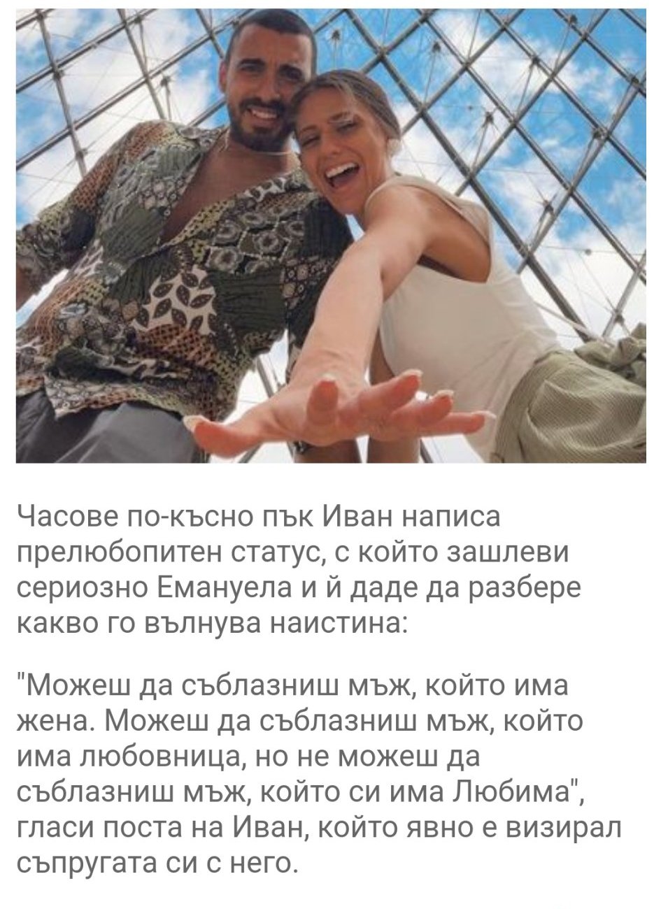 до колкото разбрах Иван я заряза и се отказал, защото има бебе на 10 м., о жена му ревнува от Емануела....то не беше,  че има силикон, той също ...абе...флорца ми е...нека я видим днес де.....