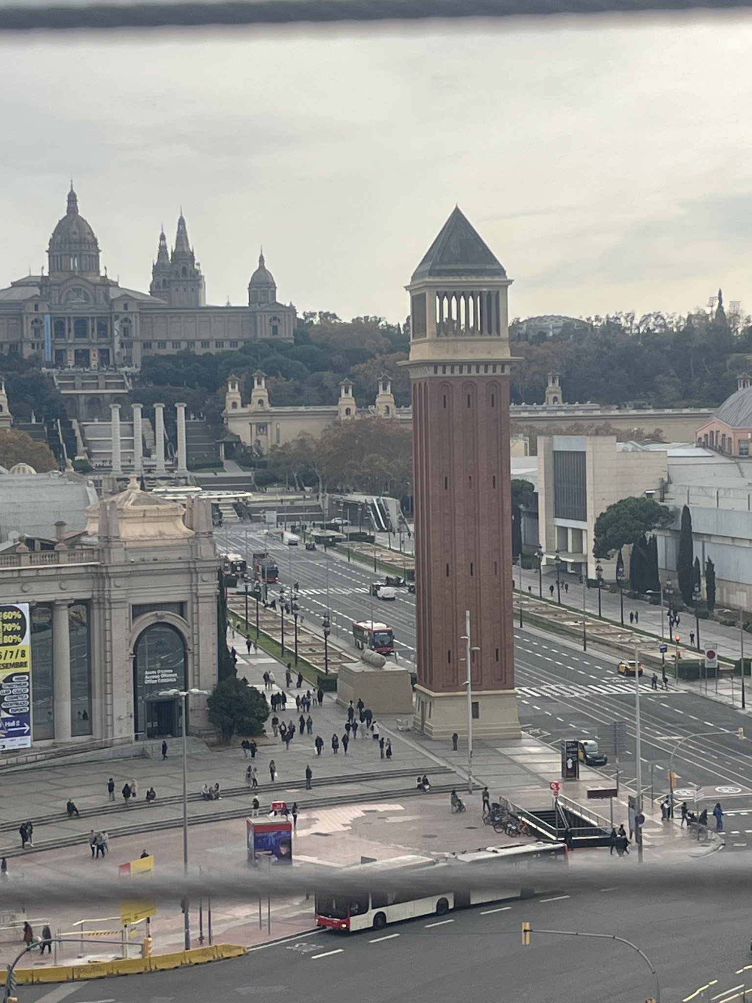 На снимката на преден план вдясно е една от двете Венециански кули (Torres Venecianes), които са разположени на площад Испания (Plaça d'Espanya).