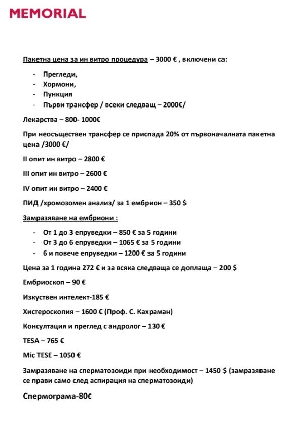 Допълнително имайте в предвид, че идвайки от Мемориал намерих болницата доста мърлява. Няма да навлизам в подробности, който го интересува да ми пише, но в крайна сметка ние отиваме там и даваме едни сериозни суми не за да ни подритват и да ни тъпчат с ненужни лекарства а за да сме в безопасна и приятна среда в този така уязвим момент за всяка двойка. А не за да им е угодно на Съботно-Неделната програма, пък ако не стане нали пак ще си платим, то къде 5 там и 6 пункции.