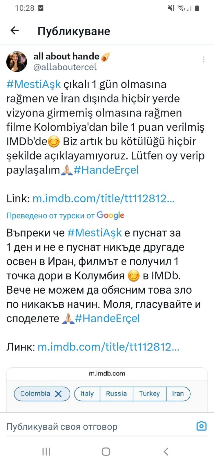 И по повод коментиранта тема за фенки и анти такива, поредното потвърждение, колко болни мозъци има. Не знам керемки ли са, просто не понасят Ханде ли, но това за мен нормален човек не може да го направи. Поне гледай филма и тогава сложи 1 точка. Та в този филм не е само тя. Признавам си, че малко съжалявам такива хора, защото не може да имаш личен живот, да си щастлив в реала и да изсипваш такава гадост по някакви хора, които даже не познаваш.