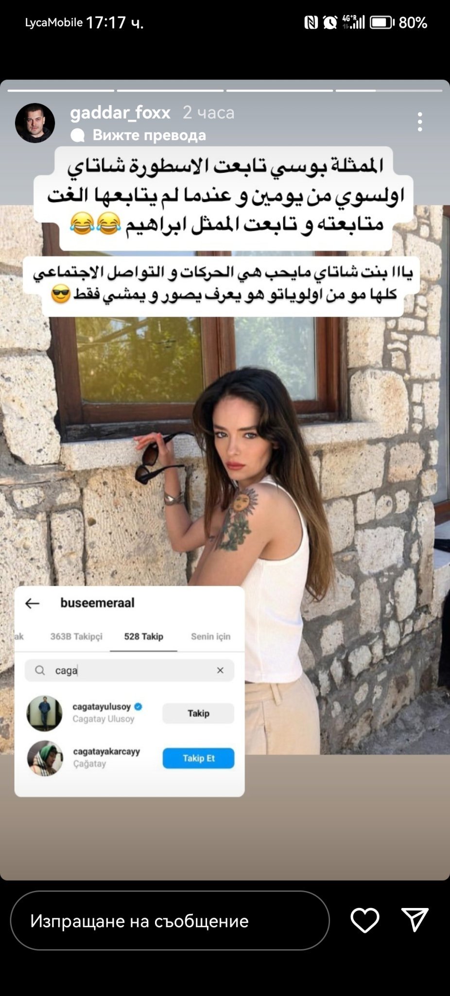Това с колежката Сюмие Айдоан никой нема го повярва . Имат добра хармония и приятелство и тя се радва да работи и учи от Чаатай, като актьор. Човека ясно и кратко каза  ''Много работя и нямам време за ашк'' . Аз му вярвам , защото е честен човек и дори да пази ревниво ЛЖ.. ако има някоя няма да скрие и излъже дори пред журналистите. Никой не е казал че като флиртува и разбошуват хормоните ще си признава и показва. Папараците знаят нерде и кога да дебнат. Това на ръката му е аксесоар - пръстен модерен . Купил го е или му е подарен  от някого и само той знае дали има по специална стойност . Преди не е носил аксесоари незавасимо какви .  Стила му е небрежно елегантен в любимия цвят черен .  Сега му е толкова добре така и промяната е видима .. разцъфтя , промени се .. по социален е и още по красив и в настроение , живее си живота от както е свободна птица.  Тежест му падна и от него и от нас .  Никога не е плащал данък обществено мнение за каквото и да е било и това му прави чест ! Ние, че нема да одобрим  никоя и ще го пазим и ще завиждаме е ясно .  Като му знаем вкуса... не е задължително да е известна и мис свят и да има кариера . Няма лошо да е по обикновена симпатична и темпераментна.
