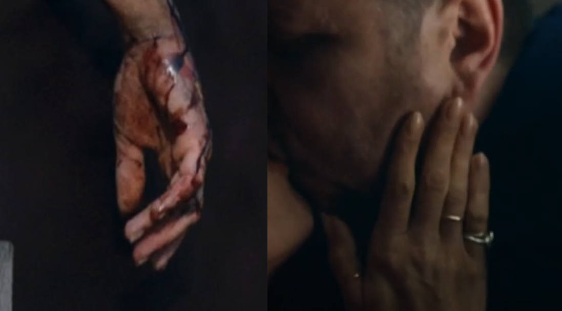 Ето ръката на Рая Пеева във филма (не успях да намеря по-ясен кадър) и окървавената ръка. Мисля, че наистина е нейната.