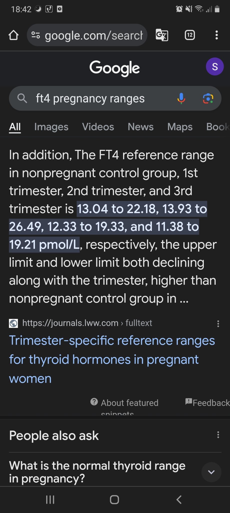 TSH ми е 1.32 (референтни 0.27 - 4.2), а FT4 е 13.69 (референтни 12-22). На л-тироксин съм - 25мгр. Нямам възможност да отида до София сега, притеснителен ли е FT4? Колко трябва да е по време на бременността? Сега влизам в 5-тия месец и съм силно обезпокоена. Не зная какво да правя. Зная, че TSH не трябва да надвишава 3, а без бременност ft4 да е във втората част на референтните, но сега доближава долна граница и ... моля за съвет.