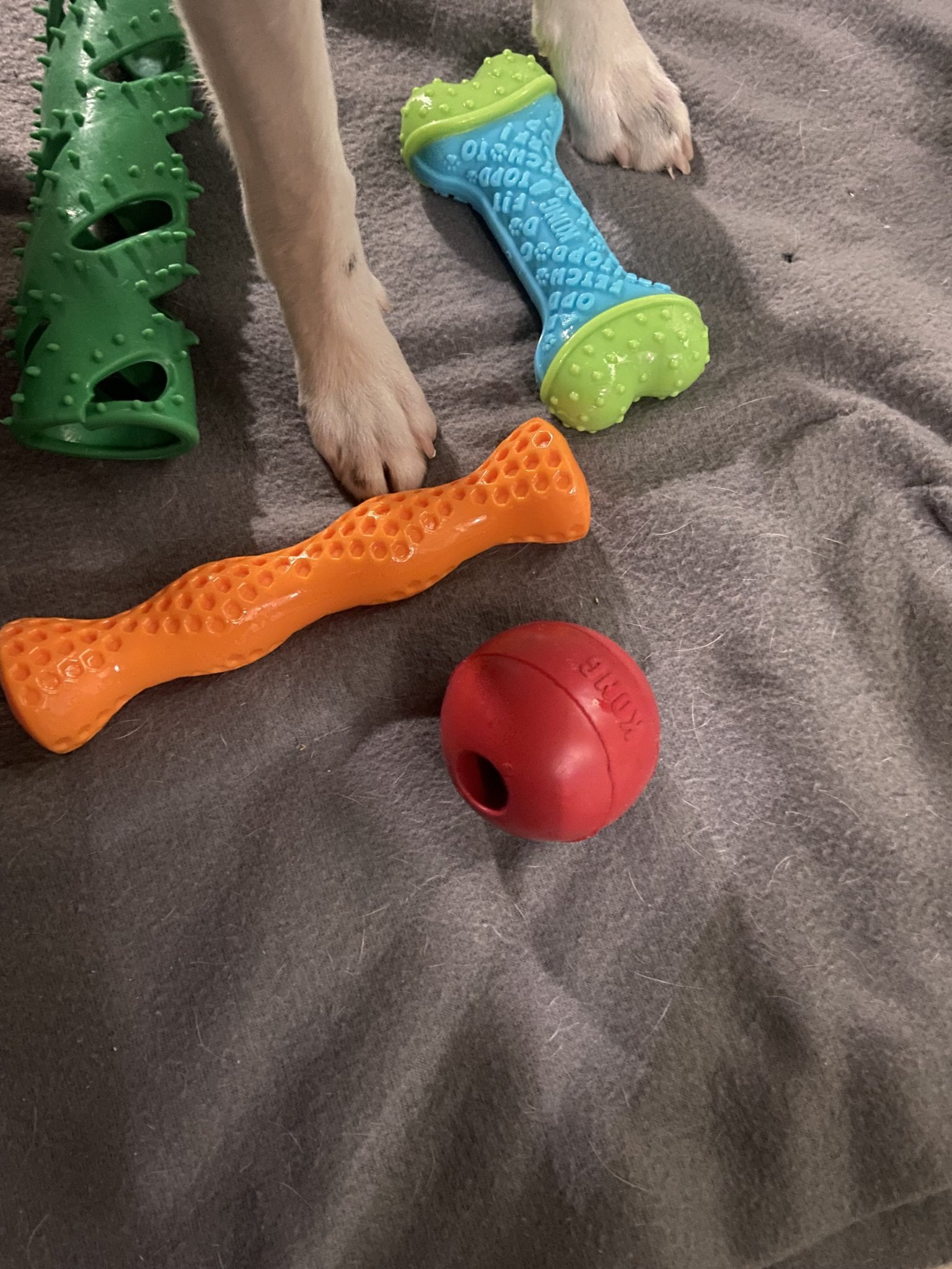 Поръчах топка Kong, малък размер обаче много е тежка и за в момента няма особен интерес и към нея, същото важи и за синьо-зеления кокал на Kong.