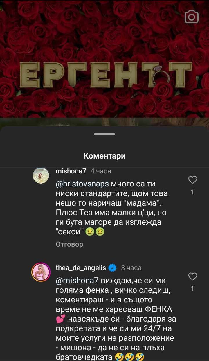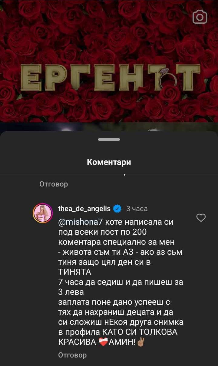 Онзи ден се зачетох в коментарите в инста на Ергена и мернах Теа да отговаря на хейт,ама забравих да споделя. Виктория в нейните сторита отговаряше много по-спокойно на хейт въпросите Grinning