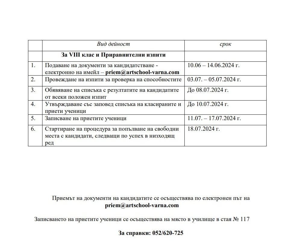Б) Ако  детето е ориентирано към училище по изкуства към МК, то сроковете са индивидуални във всяко училище, но са юни.  Трябва да се провери.