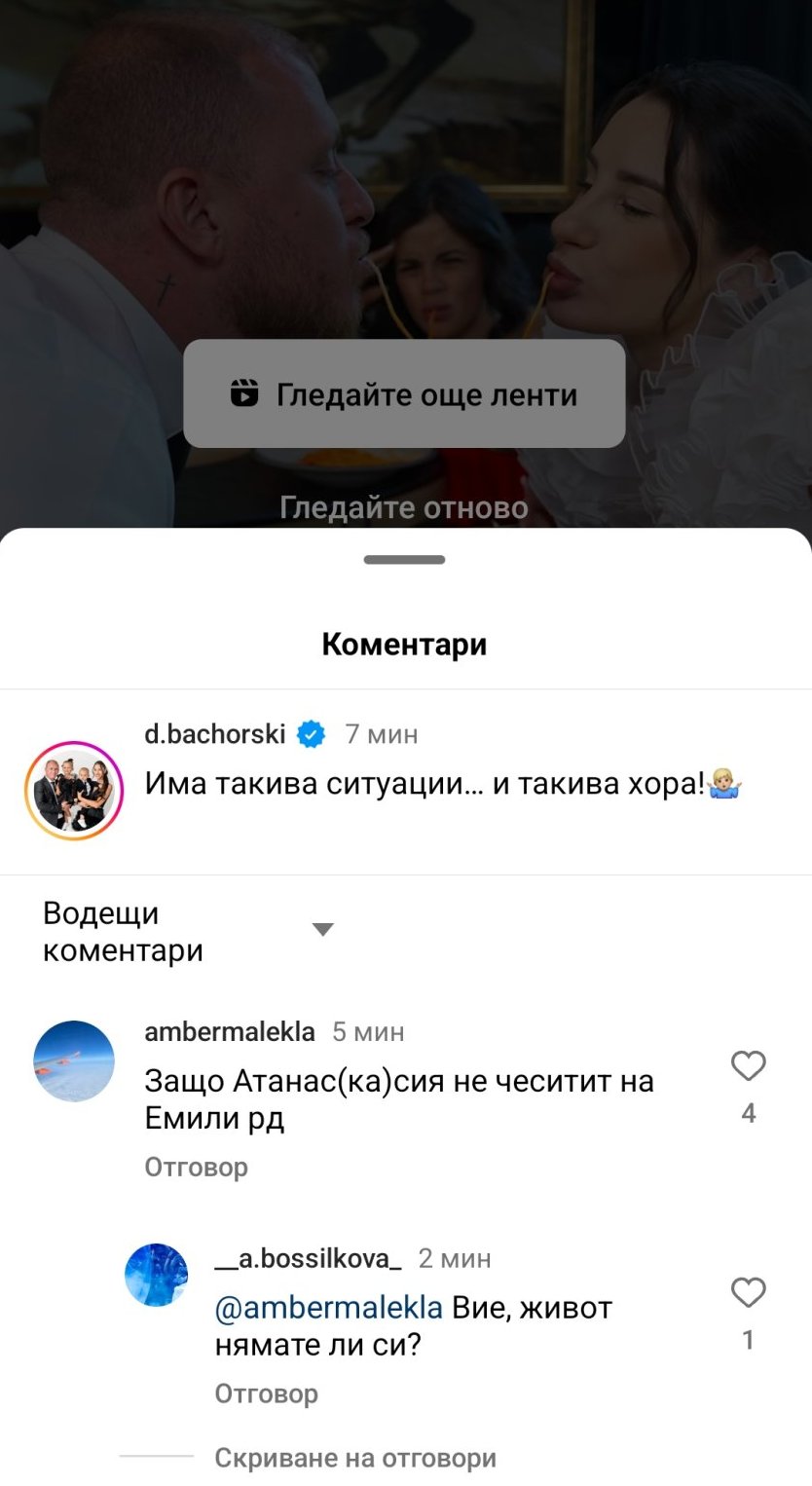 За сметка на това пък в Петър няма никакъв живец. Мисля, че Емилия не му отива. И аз смятам, че с Даниел са хубава двойка, но и сякаш си приличат по темперамент. На мнение съм, че в една двойка противоположностите се привличат. Когато единия е огън, другия трябва да е вода, за да го укроти. Даниел и Емилия са ми по-огнени, а Атанаска и Петър по-заспали, но явно са се намерили и един друг.