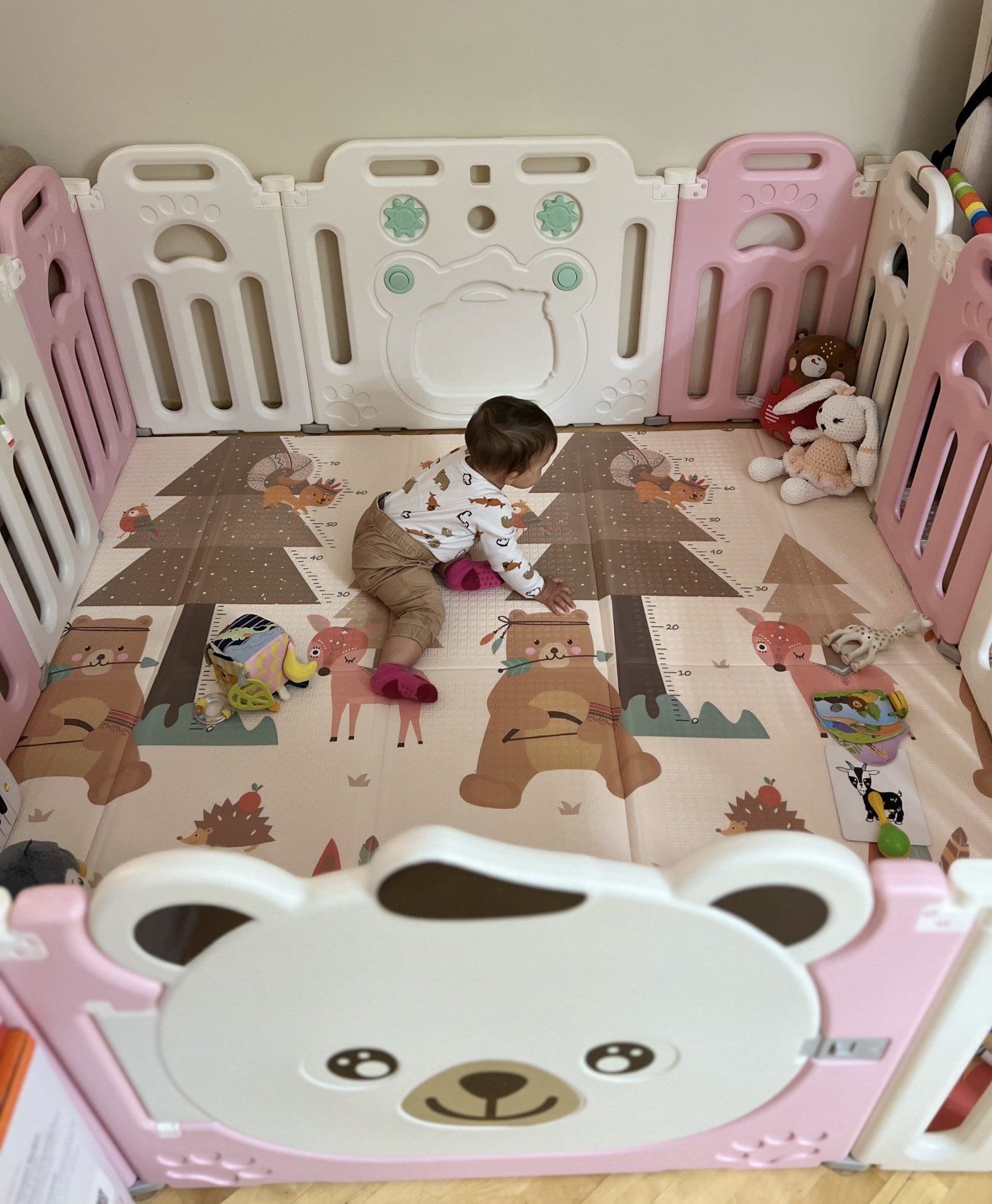 Ние взехме такъв тип ограда, от олх и за сега съм доволна. Оставям я там, когато имам да свърша нещо, а тя си се занимава. Така ми е по- спокойно, но не мисля да я ограничавам само там. Проблемът при нас е, че още не лази като хората, за сметка на това обаче ме използва за стълб и се катери по мен- обожава да стои права. А на мен хич не ми се нрави това на този етап…