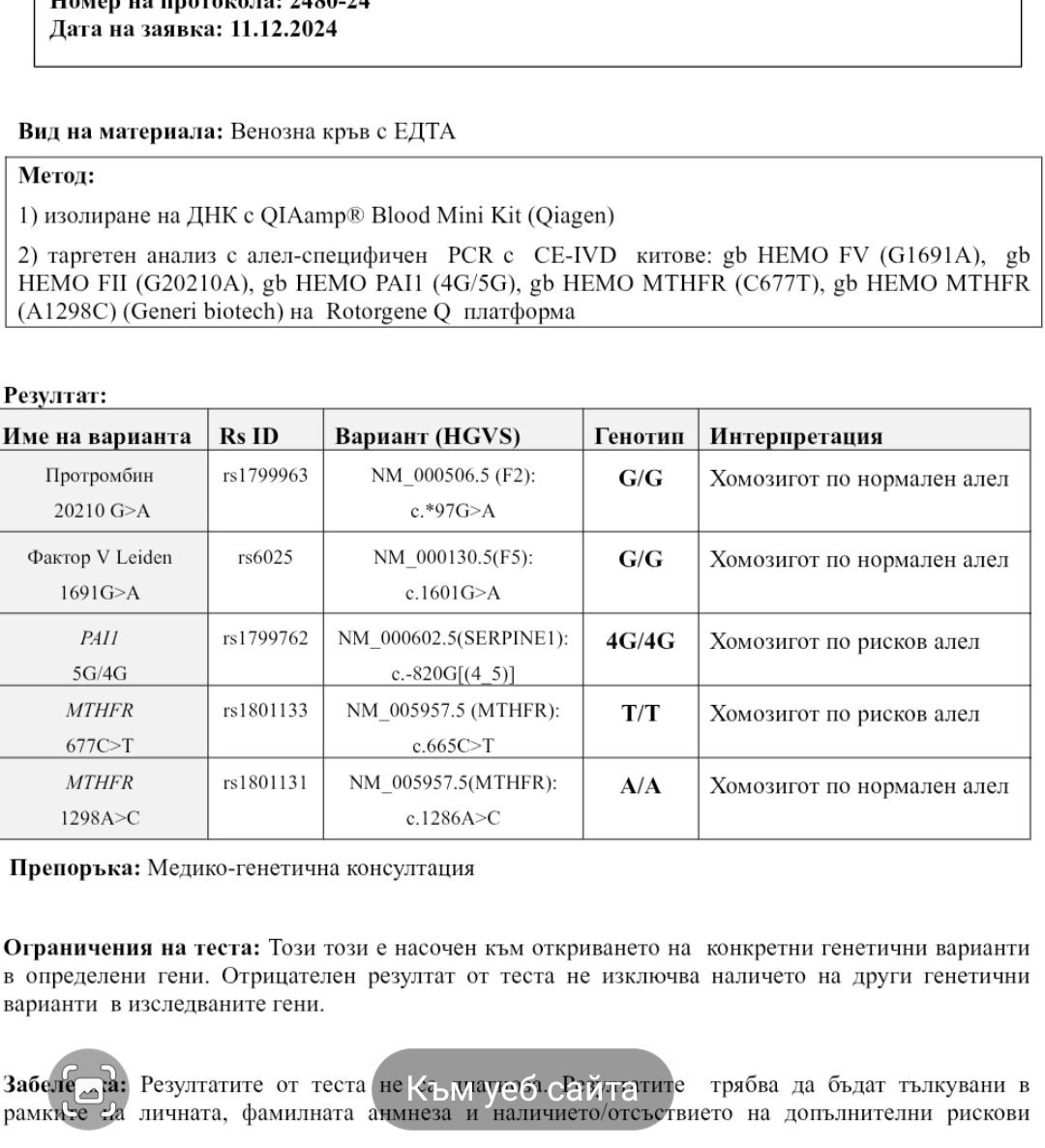 Здравейте, някой може ли да ми помогне в разчитането на изследванията ми за тромбофилия , бременна съм в 7 седмица и гинеколога ми ми е изписал да пия само хапчета Непфолик мета, дали не трябва да съм на инжекции? Много ми е притеснено защото имам един спонтанен аборт и една бременност която спря в 8 седмица ?